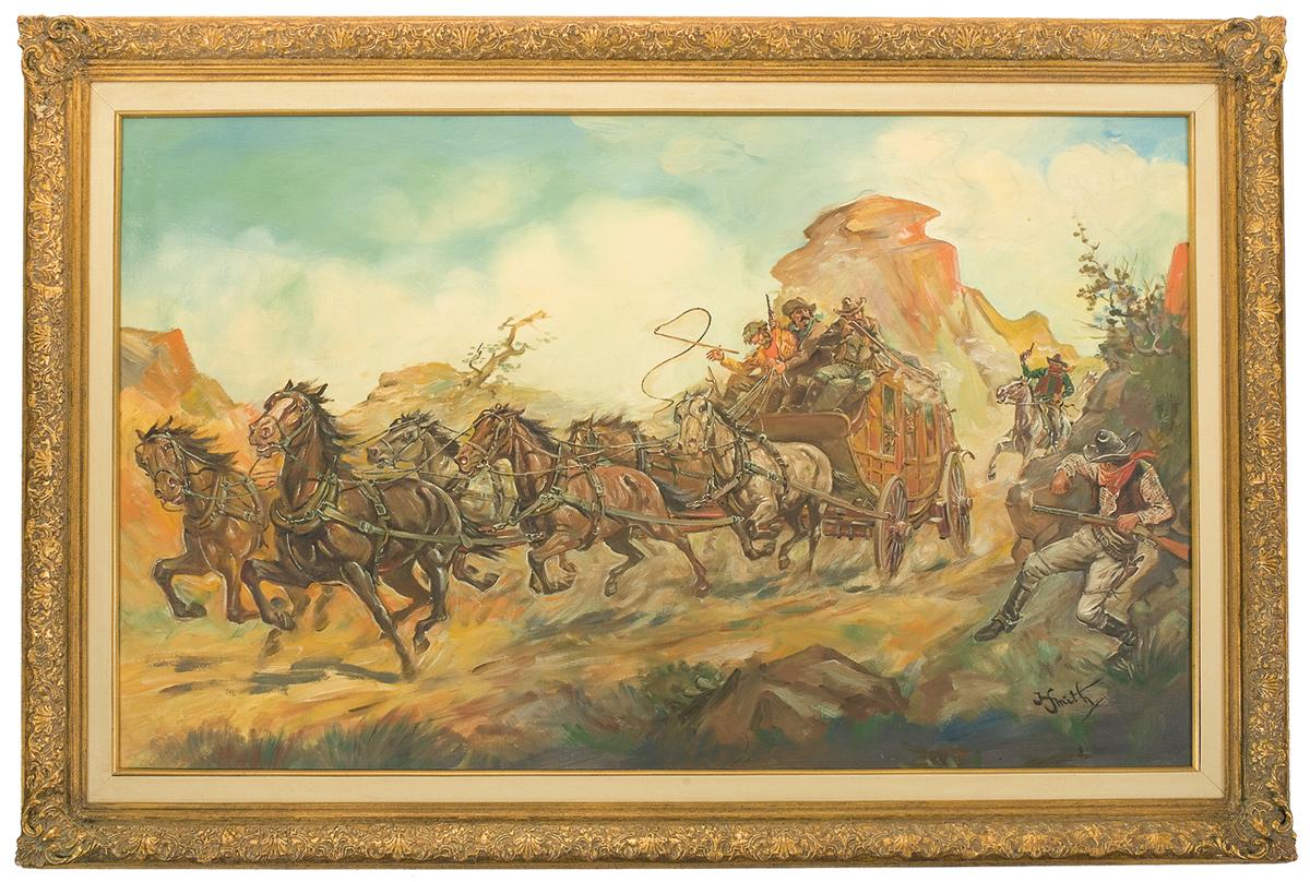 Oil painting on canvas depicting a stagecoach robbery scene by Jim Smith (see image). Signed by the artist. Canvas: 48"x30". Wooden frame: 54 1/2"x36 3/4". Jim Smith is a commercial artist and illustrator who created the western theme for the Marlboro brand in 1980.