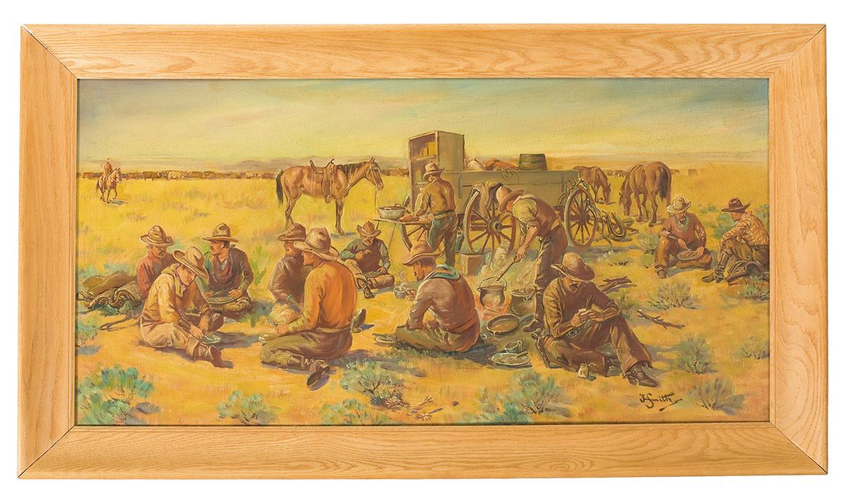 Oil painting on canvas depicting a cowboy campfire scene by Jim Smith (see image). Signed by the artist. Canvas: 47"x24". Wooden frame: 53"x29 1/2". Jim Smith is a commercial artist and illustrator who created the western theme for the Marlboro brand in 1980.