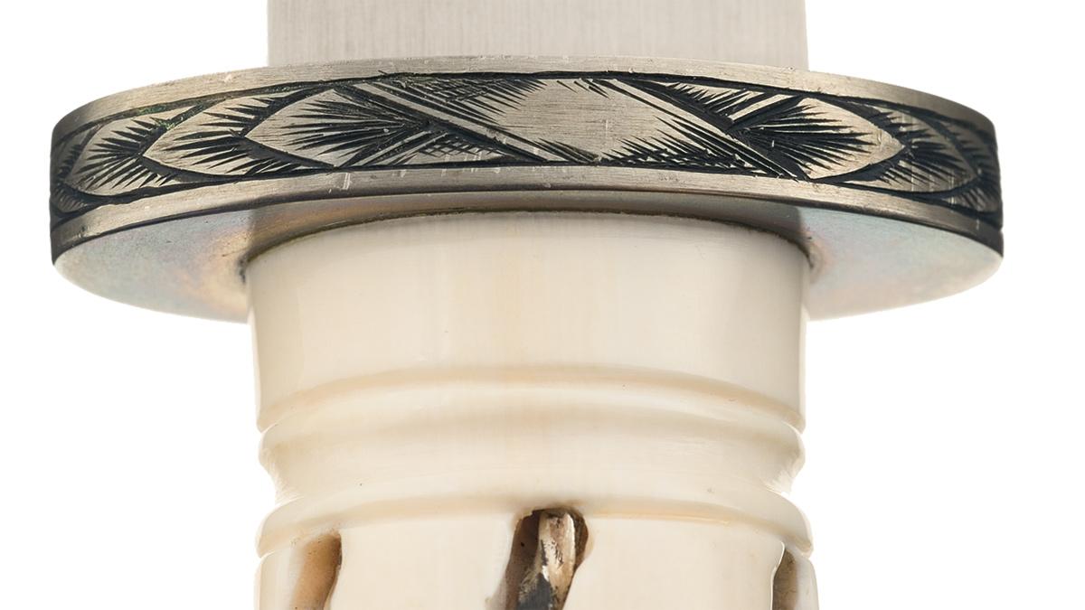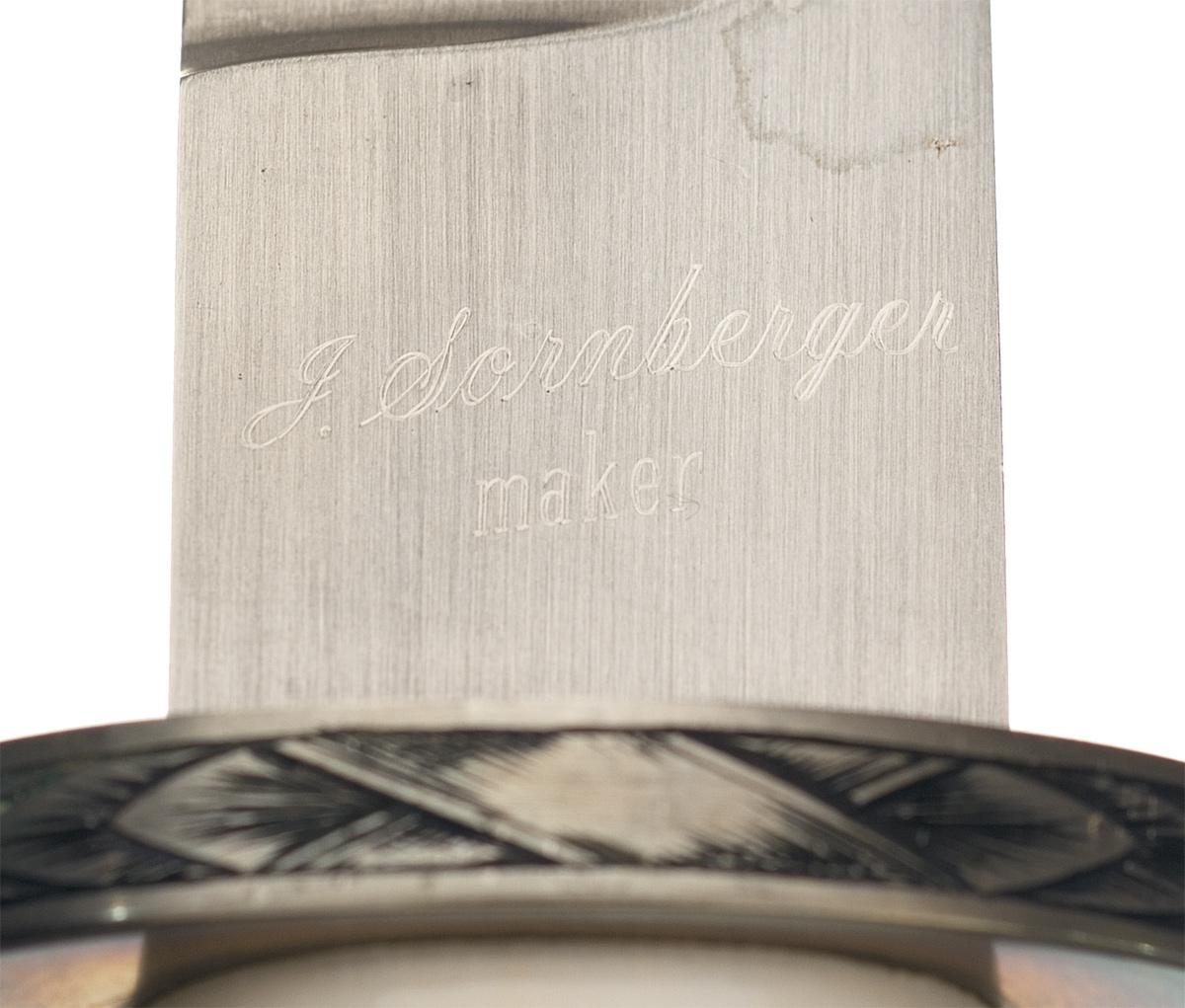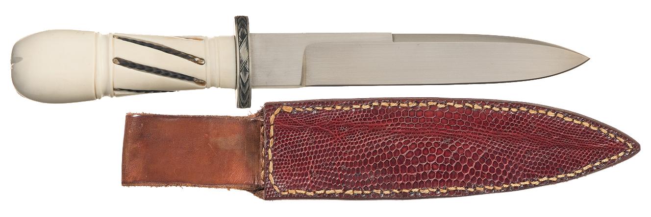 This knife was fabricated by Jim Sornberger who is a Knifemaker's Guild member from Volcano, California and is known for using a variety materials for his handles. This Sornberger knife features a 6 1/8 inch blade marked "J. Sornberger / maker". The oval guard is engraved. The ivory handle has slots filled with stripes of twisted silver and there are artful groves radiating from the handle finial that is set flush with the ivory. OAL: 10 1/4" Complete with a leather sheath with the front adorned with reptile skin and the back hand marked "SORNBERGER".
