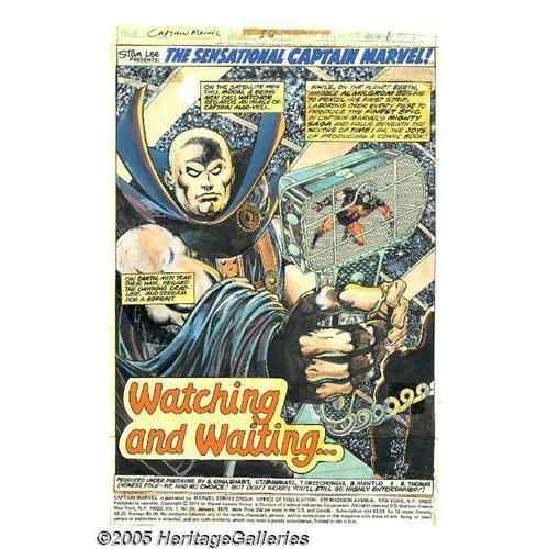 <B>Jim Starlin - Captain Marvel #36, Hand Colored Splash Page 1 Original Art (Marvel, 1974).</B></I> Take a good look at this stellar, hand-painted splash -- the only " "<B>Captain Marvel</B></I> series page one splash penciled, inked, and painted by Jim Starlin -- as the Watcher regards an image of Captain Mar-vell on his hand-held viewer. This scintillating first page framed this issue's story, ""The Coming of Captain Marvel!,"" which reprinted the first appearance of Captain Marvel, from " "<B>Marvel Superheroes</B></I> #12. Writer Steve Englehart titled this short sequence ""Watching and Waiting...,"" and he poked fun at artist Al Milgrom for missing his deadline, forcing Marvel to have to pull this story out of the files. The image area measures 10"" x 15"" and aside from some glue and tape stains, mostly outside of the image area, the art is in Very Good condition. <BR><BR><B>Important notice:</B> Heritage usually auctions material at the rate of 200-250 lots per hour. On some occasions eBay Live bid software or the Internet may not be able to keep up with the pace of the auction. We recommend placing a realistic absentee bid now as insurance to avoid disappointment. Occasionally the auctioneer may eliminate or reject an eBay Live bid, and the auctioneer may also reopen a lot after the close of the eBay live bidding (usually because we missed an audience bid), and may reject your bid even if it shows you as the winning bidder. By bidding via eBay Live, you agree that Heritage may award the lot to another bidder at its sole discretion under the circumstances described above or any other reasonable circumstances. Since eBay bids are not shown to us until we open the lot on the floor, we treat those bids just like floor bids. In most cases the floor responds before the eBay bid is presented to us, due to Internet lag time, so for consistency we have made it a policy that floor bids are always considered first over tie eBay live bids. Also please note that all He