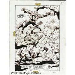 <B>Jim Starlin - Death of Captain Marvel Graphic Novel, page 56 Original Art (Marvel, 1982).</B></I> Captain Marvel says "talk to the hand," as he knocks the tar out of his most dangerous foes, including the Megaton, the Nuclear Man, Deathgrip, the Super Skrull, and Starfox. The moving <B>Death of Captain Marvel</B></I> storyline was inspired by the death of Jim Starlin's own father, who died from cancer. The image area of this stupendous splash measures 11.75" x 17.5". The art was inked in marker, which has begun to turn slightly towards a sepia hue; otherwise the art is in Excellent condition. If you've always craved a hard-hitting Jim Starlin Captain Marvel splash, search no further!