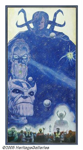 <B>Jim Starlin - Infinity Gauntlet Promotional Poster Original Art (Marvel, 1991).</B></I> The dark demi-god Thanos controls the fate of the universe with his Infinity Gems. The heroes of Earth band together to stop him, including the X-Men, the Avengers, the Fantastic Four, Spider-Man, Hulk, Warlock, Silver Surfer, and more. But Thanos has become so powerful that they are like gnats to him. Even the powerful cosmic entities like Eternity, the Watchers, Mephisto, and the Living Tribunal are unable to stop him. Jim Starlin's powerful story, <B>The Infinity Gauntlet</B></I>, was a landmark 6-issue mini-series published in the early 90s that would pave the way for several sequels. This stunning original painting by Starlin was used as a promotional poster. It has an image area of 18" x 35", and is in Excellent condition.