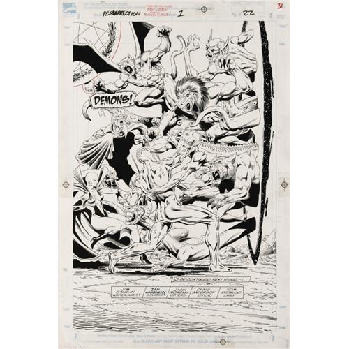 <B>Jim Starlin - Silver Surfer/Warlock: Resurrection #1, Splash page 22 Original Art (Marvel, 1993).</B></I> Silver Surfer, Adam Warlock, and Moondragon take on a small army of demons, in this stellar splash page by Jim Starlin. Offered here is page 22 from the story, "The Pact Part 1," written and illustrated by Jim Starlin. The image area measures 10" x 15" and the condition is Excellent. <BR><BR><B>Important notice:</B> Heritage usually auctions material at the rate of 200-250 lots per hour. On some occasions eBay Live bid software or the Internet may not be able to keep up with the pace of the auction. We recommend placing a realistic absentee bid now as insurance to avoid disappointment. Occasionally the auctioneer may eliminate or reject an eBay Live bid, and the auctioneer may also reopen a lot after the close of the eBay live bidding (usually because we missed an audience bid), and may reject your bid even if it shows you as the winning bidder. By bidding via eBay Live, you agree that Heritage may award the lot to another bidder at its sole discretion under the circumstances described above or any other reasonable circumstances. Since eBay bids are not shown to us until we open the lot on the floor, we treat those bids just like floor bids. In most cases the floor responds before the eBay bid is presented to us, due to Internet lag time, so for consistency we have made it a policy that floor bids are always considered first over tie eBay live bids. Also please note that all Heritage lots purchased through eBay Live carry a 22.5% Buyer's Premium. Please make sure you read the Terms and Conditions before you bid. This lot is being auctioned in conjunction with a live floor auction by Heritage Auction Galleries. All final auction and invoice information will be supplied by Heritage Auction Galleries, and all other information should be considered preliminary. Lot:41001 <BR><BR><B>Winning Notification and Billing:</B> After the FINAL session in this auction is complete, Heritage will send e-mail and snail mail invoices. This process normally takes several days. All final auction and invoice information will be supplied by Heritage Auction Galleries, and all other information should be considered preliminary. <BR><BR>This auction will be conducted on a live auction floor and over the Internet through eBay Live. If you choose to place an absentee bid, please take a moment to <font color='#0000ff'><u><a href='http://pages.ebay.com/liveauctions/help/before/laabsentee.html'>learn how eBay Live absentee bidding works</a></u></font><font color='#000000'>