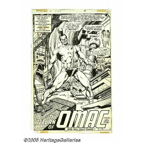 <B>Jim Starlin and Joe Rubinstein - Kamandi, the Last Boy on Earth #59, Splash Page 2 Original Art (DC, 1978).</B></I> Brother Eye and OMAC form an invincible, well-oiled, fighting machine, ever ready to defend the weak and destroy the wicked of this confused world. Jim Starlin writes and pencils another finely-crafted, star crossed story, ""The Return of OMAC,"" for the final issue of " "<B>Kamandi</B></I>. The image area measures 10"" x 15"", and, although there is a bit of glue and tape staining along the edges, and the bottom left edge has been trimmed during the production process, the art remains in Excellent condition. Let all who harbor darkness in their hearts beware... OMAC lives! <BR><BR><B>Important notice:</B> Heritage usually auctions material at the rate of 200-250 lots per hour. On some occasions eBay Live bid software or the Internet may not be able to keep up with the pace of the auction. We recommend placing a realistic absentee bid now as insurance to avoid disappointment. Occasionally the auctioneer may eliminate or reject an eBay Live bid, and the auctioneer may also reopen a lot after the close of the eBay live bidding (usually because we missed an audience bid), and may reject your bid even if it shows you as the winning bidder. By bidding via eBay Live, you agree that Heritage may award the lot to another bidder at its sole discretion under the circumstances described above or any other reasonable circumstances. Since eBay bids are not shown to us until we open the lot on the floor, we treat those bids just like floor bids. In most cases the floor responds before the eBay bid is presented to us, due to Internet lag time, so for consistency we have made it a policy that floor bids are always considered first over tie eBay live bids. Also please note that all Heritage lots purchased through eBay Live carry a 20% Buyer's Premium. Please make sure you read the Terms and Conditions before you bid. This lot is being auctioned in conjunction with