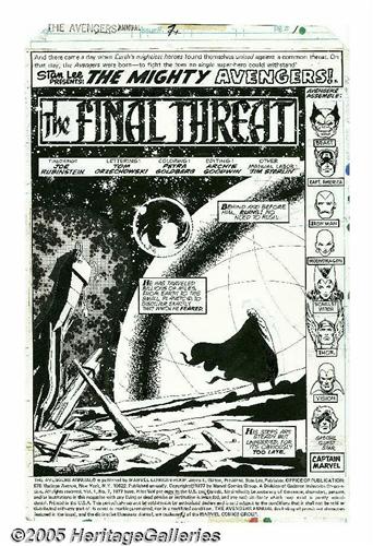 <B>Jim Starlin and Joe Rubinstein - The Avengers Annual #7, Splash Page 1 Original Art (Marvel, 1977).</B></I> Anyone who has had the pleasure of reading Jim Starlin's original <B>Warlock</B></I> series knows that it's a masterful space epic that acts as a metaphor for faith, religion, and the corruption and salvation of the spirit. It is from this place that we arrive at <B>Avengers Annual</B></I> #7, where Starlin revisits both Adam Warlock and one of his greatest nemeses, Thanos of Titan. The story opens with this moody splash page as Warlock surveys more damage in the wake of Thanos' corruption. Inset with images of the Avengers and Captain Marvel, this is a truly cosmic splash page like no other! The image area measures 10" x 15", and aside from some edges being trimmed during the production process, the art is in Excellent condition.