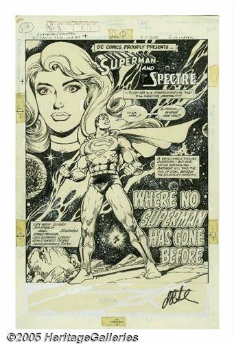 <B>Jim Starlin and Romeo Tanghal - DC Comics Presents #29, Splash Page 1 Original Art (DC, 1981).</B></I> With the help of the Spectre, Superman tries to transcend the boundaries of reality to catch up to a comatose Supergirl, in this issue of <B>DC Comics Presents</B></I>. The story, "Where No Man Has Gone Before," was written by Len Wein, and this starlit splash page was penciled by Jim Starlin, who knows a thing or two about cosmic epics, and lavishly inked by Romeo Tanghal. The image area measures 10" x 15", and, although there is a bit of aging apparent, the art remains in Excellent condition. Signed by Jim Starlin at the lower right.