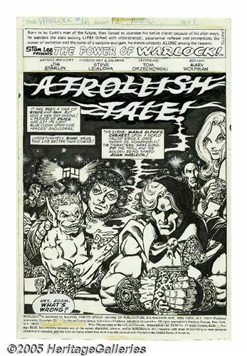 <B>Jim Starlin and Steve Leialoha - Warlock #12, page 1 Splash Page Original Art (Marvel, 1976).</B></I> The scene: Mama Alpha's Cabaret, upon a world called Sirus X, once known as Homeworld. The characters: Mama Alpha, Pip the Troll and the golden being named Adam Warlock. This celestial splash page is from 1976, and writer/artist Jim Starlin was at his absolute best, elevating Warlock to an utterly unique, compelling character with gripping characterization, thought provoking philosophy and theology, and good old superhero bustem' up action. Starlin's art here is superb, heavy on brooding shadows, with a striking panel composition and an enthralling set. The art has an image area of 10" x 15," and is in Excellent condition.