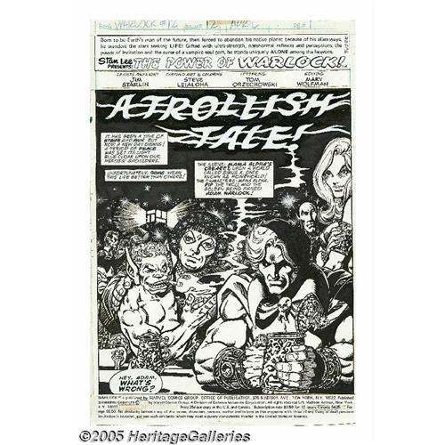 <B>Jim Starlin and Steve Leialoha - Warlock #12 Splash Page 1 Original Art (Marvel, 1976).</B></I> The scene: Mama Alpha's Cabaret, upon a world called Sirus X, once known as Homeworld. The characters: Mama Alpha, Pip the Troll and the golden being named Adam Warlock. This celestial splash page is from 1976, and writer/artist Jim Starlin was at his absolute best, elevating Warlock to an utterly unique, compelling character with gripping characterization, thought provoking philosophy and theology, and good old ""bust 'em up"" superhero action. Starlin's art here is superb, heavy on brooding shadows, with a striking panel composition and an enthralling set. The art has an image area of 10"" x 15,"" and is in Excellent condition. <BR><BR><B>Important notice:</B> Heritage usually auctions material at the rate of 200-250 lots per hour. On some occasions eBay Live bid software or the Internet may not be able to keep up with the pace of the auction. We recommend placing a realistic absentee bid now as insurance to avoid disappointment. Occasionally the auctioneer may eliminate or reject an eBay Live bid, and the auctioneer may also reopen a lot after the close of the eBay live bidding (usually because we missed an audience bid), and may reject your bid even if it shows you as the winning bidder. By bidding via eBay Live, you agree that Heritage may award the lot to another bidder at its sole discretion under the circumstances described above or any other reasonable circumstances. Since eBay bids are not shown to us until we open the lot on the floor, we treat those bids just like floor bids. In most cases the floor responds before the eBay bid is presented to us, due to Internet lag time, so for consistency we have made it a policy that floor bids are always considered first over tie eBay live bids. Also please note that all Heritage lots purchased through eBay Live carry a 20% Buyer's Premium. Please make sure you read the Terms and Conditions before you bid. This lot is