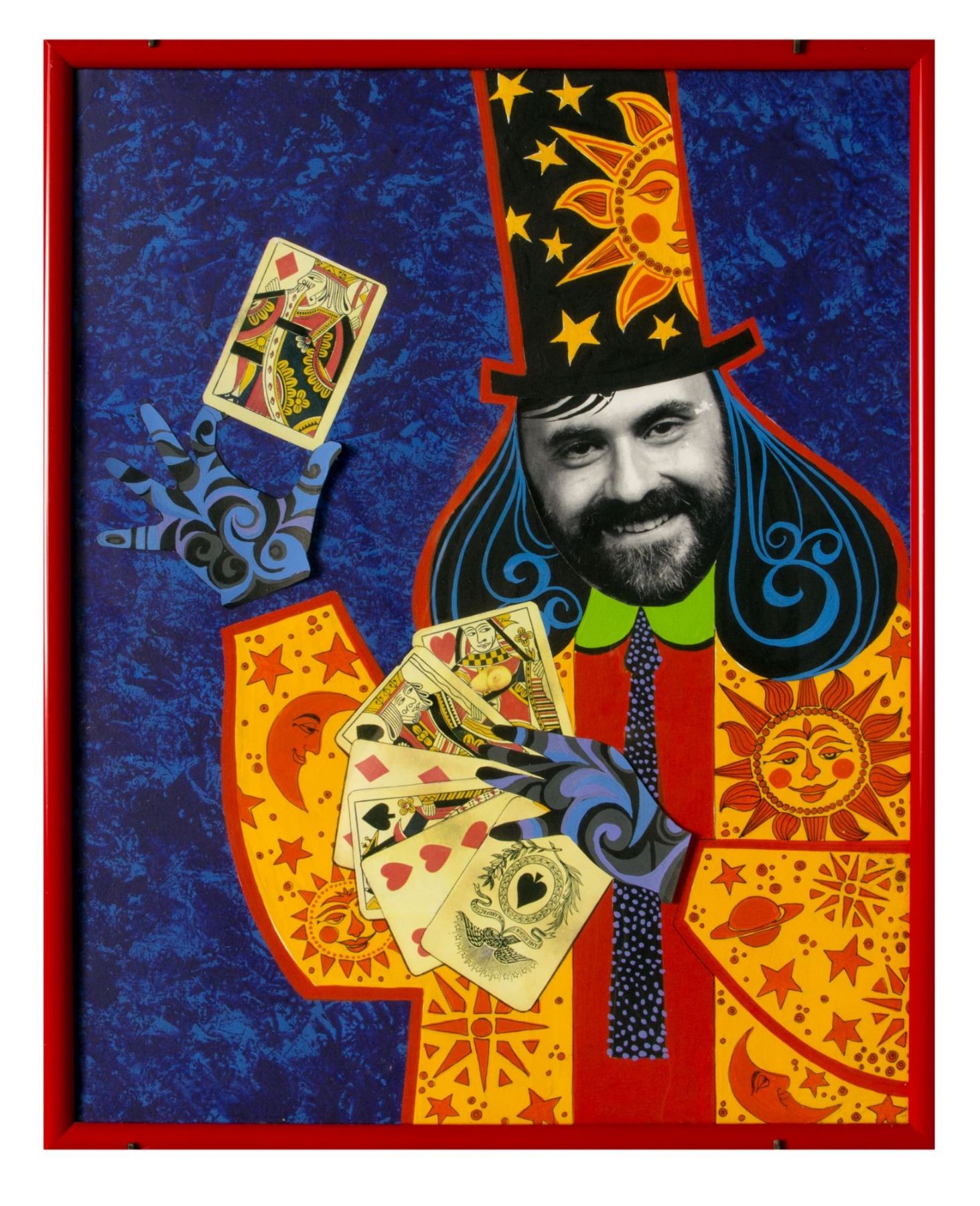 (1995) An original collage created by Rolly Crump featuring a representation of famed magic designer Jim Steinmeyer, who is a personal hero to Rolly Crump. The artwork is accomplished in acrylic with collage elements and measures 21"x17" framed. The condition is very good with minor wear.