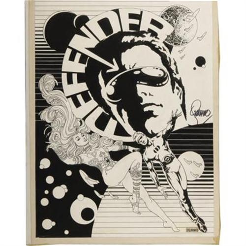 <B>Jim Steranko - Comic Crusader #13 Defender Cover Original Art (1972).</B></I> More than any other comics creator, the signature of Steranko conjures up thoughts of cutting-edge supergraphics. Steranko infused surrealism into his superheroic work and this magnificent montage is a super-charged spectacular. Measuring an overall 13.5" x 17", and in Excellent condition, this design's asymmetrically balanced visual tension is a Steranko hallmark! Steranko has signed the piece at the center-right. <I>From the Fantastic Frank Collection.</B></I><BR><BR><b>Shipping:</b> Flat Material, Small (<a target="_blank" href="http://www.heritageauctions.com/common/shipping.php">view shipping information</a>)