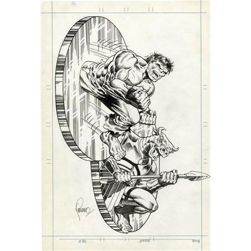 <B>Jim Steranko - Hulk 3-D Bronze Medallion Ad Illustration Original Art (Marvel, 1974). </B></I> Face front -- few interpretations of the Hulk have been more savage or splendid than Jaunty Jim Steranko's! This sensational scene was created for an eye-catching ad to promote the Marvel 3-D bronze medallions that were sold in the pages of <B>F.O.O.M. </B></I>magazine. Perhaps more than any other Silver Age creator, the "zap art" style of Jim Steranko broke new ground in comics with its cutting-edge imagery, cinematic storytelling, bold layouts, typographic excellence, and novel narratives. This magnificent Marvel masterpiece has an image area of 10" x 15", and the art is in Excellent condition. Signed at the lower left.<BR><BR><b>Shipping:</b> Flat Material, Small (<a target="_blank" href="http://www.heritageauctions.com/common/shipping.php">view shipping information</a>)