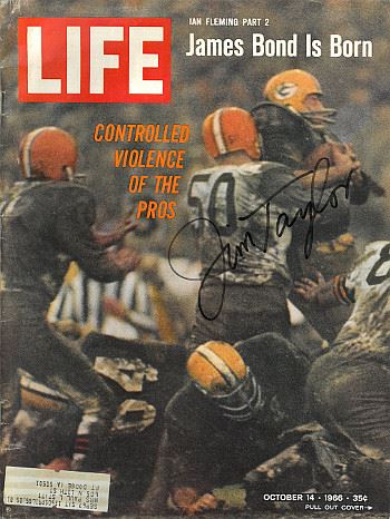 Jim Taylor played fullback in the National Football League for ten seasons, from 1958-67. He is a member of the Pro Football Hall of Fame, inducted in the summer of 1976. He was a running back for the Green Bay Packers from 1958-66. Taylor was a member of four Packer NFL championship teams (1961, 1962, 1965, and 1966), where he was teamed in the backfield with halfback Paul Hornung. Jim Taylor has hand signed this Green Bay Packers Life Full Magazine (SIZE 10.5 X 13.5) from October 14, 1966. Certificate of Authenticity from Athlon Sports Collectibles.