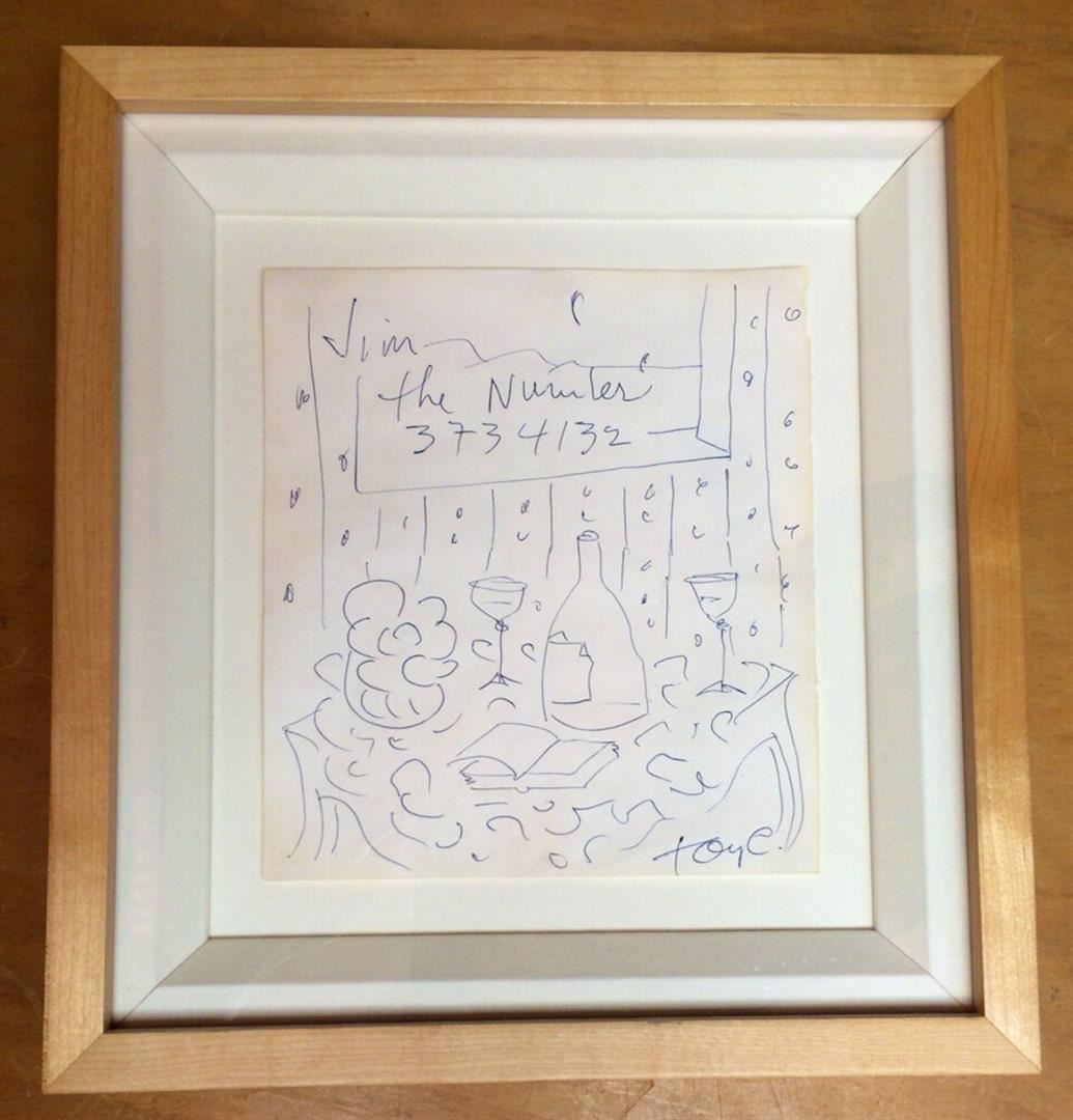 This is a 13X13" FRAMED pen & ink drawing by Tony Curtis, sketched in 1990 for his friend Jim Nabors, while they were dining at the Hotel Hana Maui. Tony wanted Jim to have his phone number and scrawled it on the paper tablecloth, along with this Matisse-like drawing. Included is a 4x6 signed postcard photo of Curtis. j.