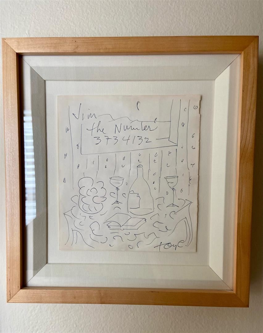This is a 13X13" FRAMED pen & ink drawing by Tony Curtis, sketched in 1990 for his friend Jim Nabors, while they were dining at the Hotel Hana Maui. Tony wanted Jim to have his phone number and scrawled it on the paper tablecloth, along with this Matisse-like drawing. Included is a 4x6 signed postcard photo of Curtis. j.