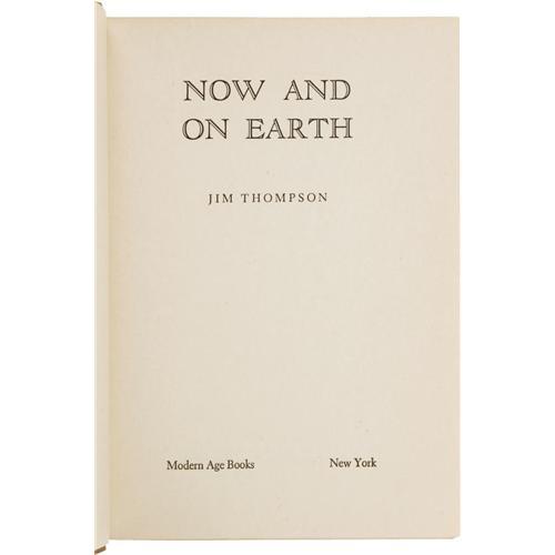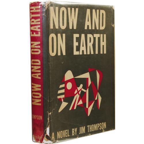 <B>Jim Thompson's Rare First Novel:<I> Now and On Earth.</B></I></B></I> (New York: Modern Age Books, 1942), first edition, 306 pages, light brown cloth with light red titles, 8vo (6" x 8"), text block slightly cocked, light shelf wear mainly at the corners, edges slightly dirty, pages slightly toned, binding cracked between pages 124-125, a tear with no loss on page 305, dust jacket tattered at the head and tail of spine and corners, else very good. Original copies of this book are rare in any condition, especially with the dust jacket.<BR><BR><b>Shipping:</b> Books & Catalogs (<a target="_blank" href="http://www.heritageauctions.com/common/shipping.php">view shipping information</a>)