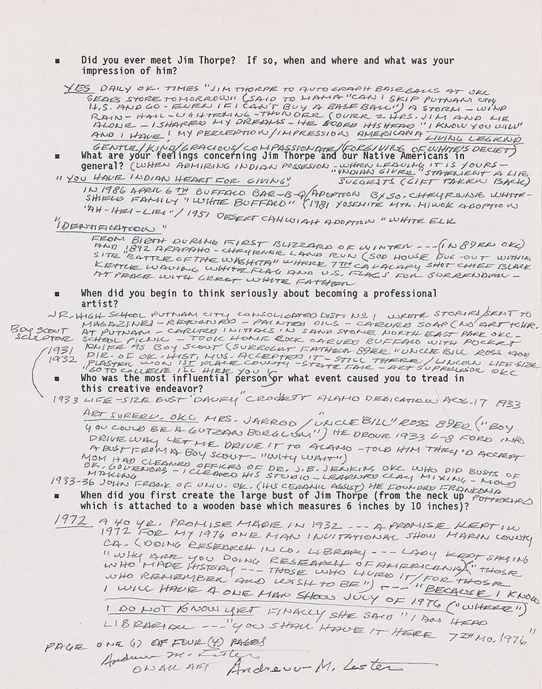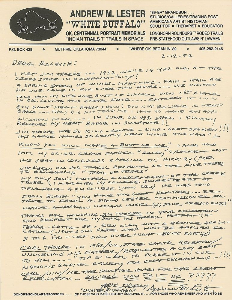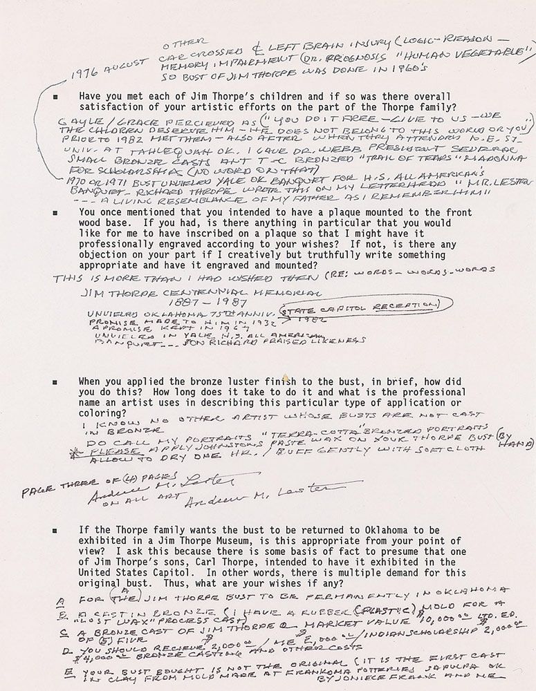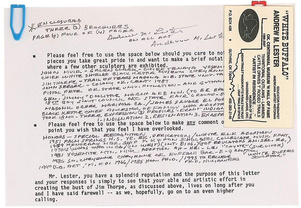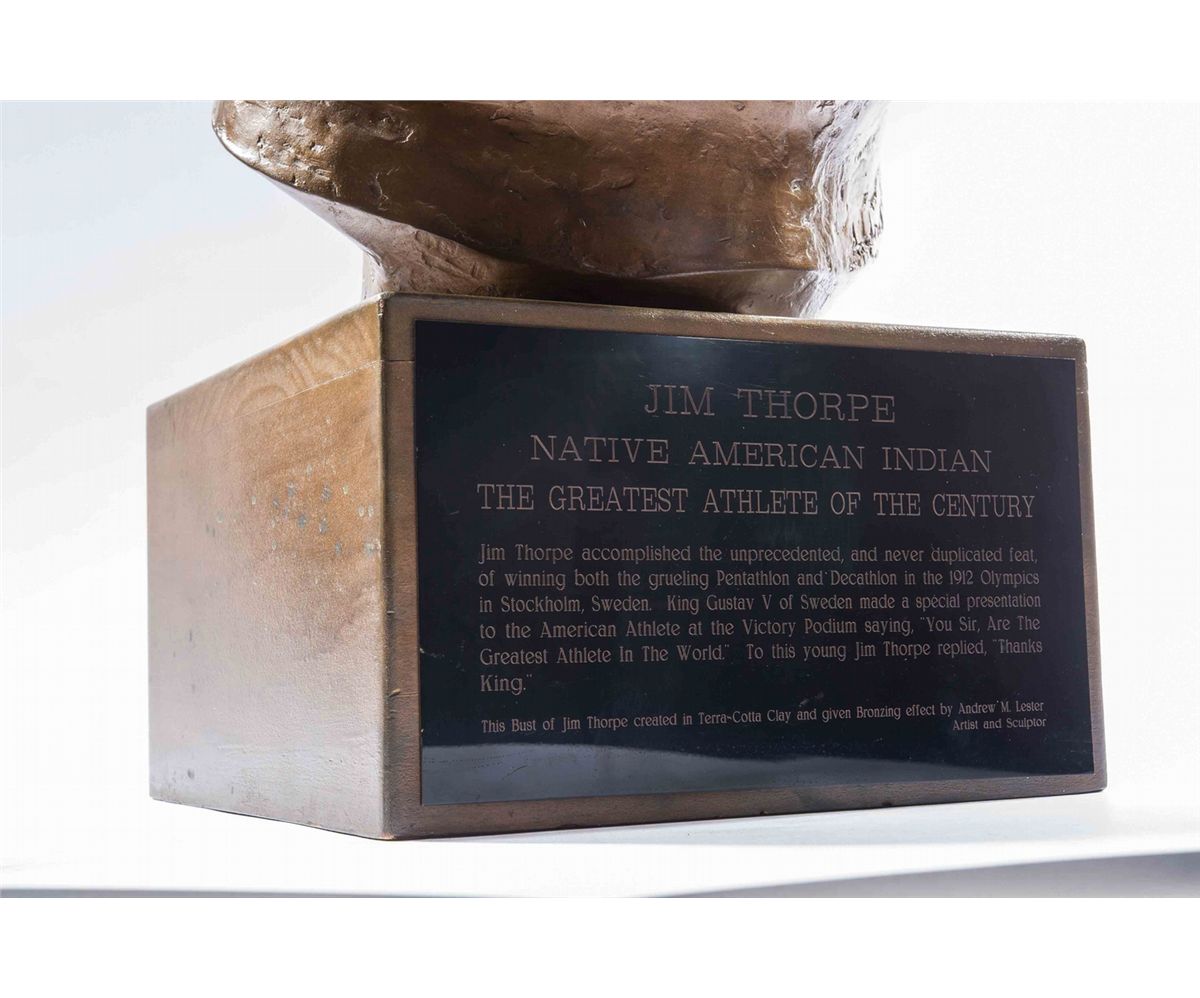 Huge terra cotta bronzed bust of Jim Thorpe. Large original bust measures approximately 16 x 14, has a bronze-like finish, and stands on a handsome 10 x 10 square base with a height of six inches, with a plaque affixed to the front which begins, “Jim Thorpe, Native American Indian, The Greatest Athlete of the Century.” Bust is signed in the mold by well-known Oklahoma artist Andrew M. Lester. This artistic bust bears a truly remarkable resemblance to this storied Native American athlete. Jim Thorpe was not only one of the greatest Olympians in history, but also a Major League Baseball player and founding player and member of the National Football League. The bronzed bust is accompanied by an impressive binder full of associated material, including correspondence between Raleigh DeGeer Amyx and artist Andrew Lester, with Lester answering an incredibly detailed four-page questionnaire from Mr. Amyx, filled out in detail by the artist, Andrew Lester, recounting his meeting with Thorpe, the techniques used in creating the bust, and information on his artistic career. Also included is correspondence between Mr. Amyx and Thorpe’s granddaughter Gail, as well as information on Lester, photos of the bust, and photos and photocopied newspaper articles on Thorpe’s major athletic accomplishments.