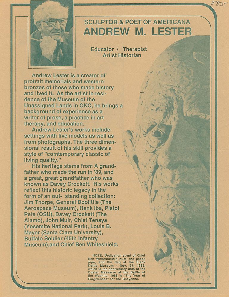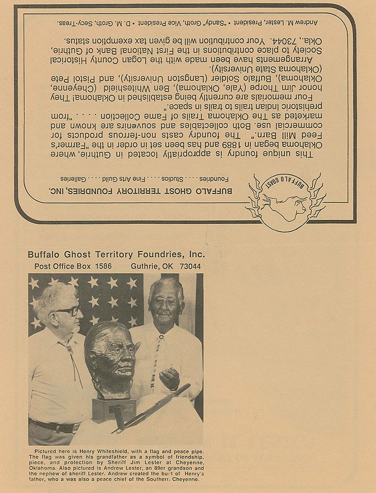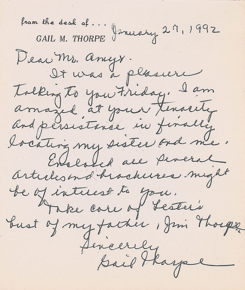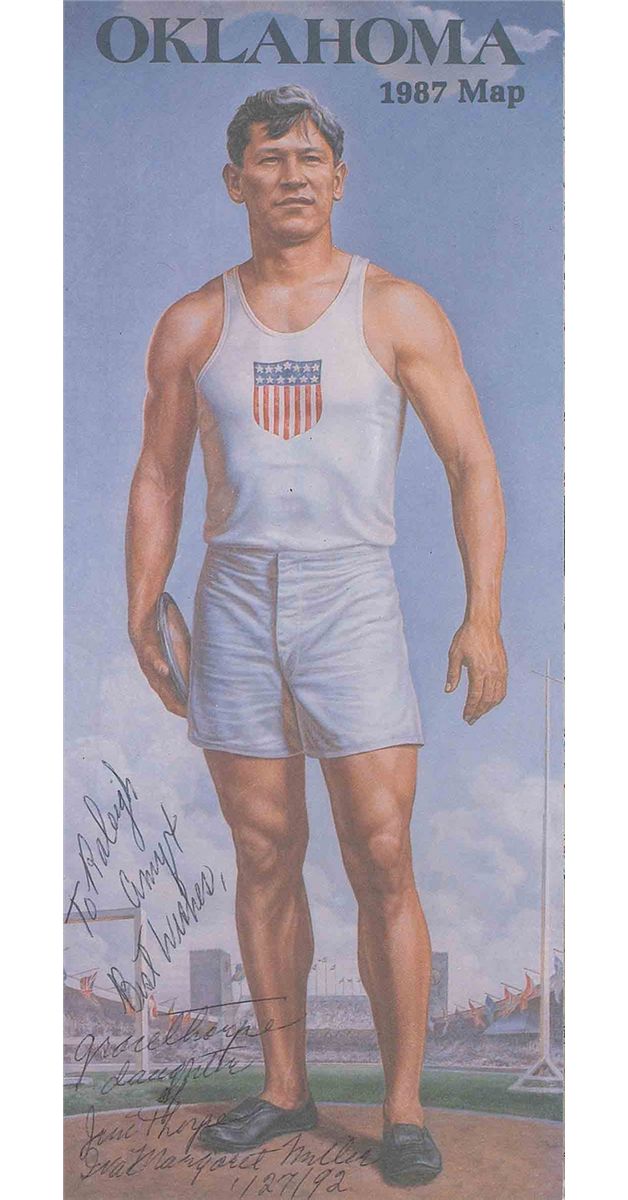 Huge terra cotta bronzed bust of Jim Thorpe. Large original bust measures approximately 16 x 14, has a bronze-like finish, and stands on a handsome 10 x 10 square base with a height of six inches, with a plaque affixed to the front which begins, “Jim Thorpe, Native American Indian, The Greatest Athlete of the Century.” Bust is signed in the mold by well-known Oklahoma artist Andrew M. Lester. This artistic bust bears a truly remarkable resemblance to this storied Native American athlete. Jim Thorpe was not only one of the greatest Olympians in history, but also a Major League Baseball player and founding player and member of the National Football League. The bronzed bust is accompanied by an impressive binder full of associated material, including correspondence between Raleigh DeGeer Amyx and artist Andrew Lester, with Lester answering an incredibly detailed four-page questionnaire from Mr. Amyx, filled out in detail by the artist, Andrew Lester, recounting his meeting with Thorpe, the techniques used in creating the bust, and information on his artistic career. Also included is correspondence between Mr. Amyx and Thorpe’s granddaughter Gail, as well as information on Lester, photos of the bust, and photos and photocopied newspaper articles on Thorpe’s major athletic accomplishments.