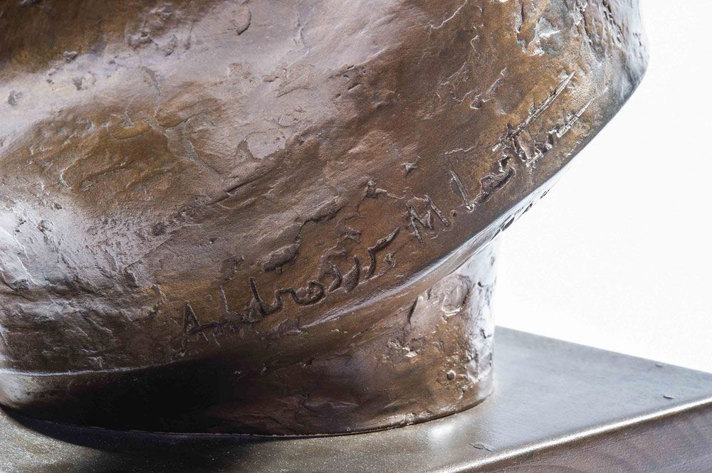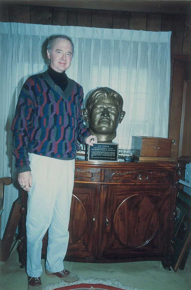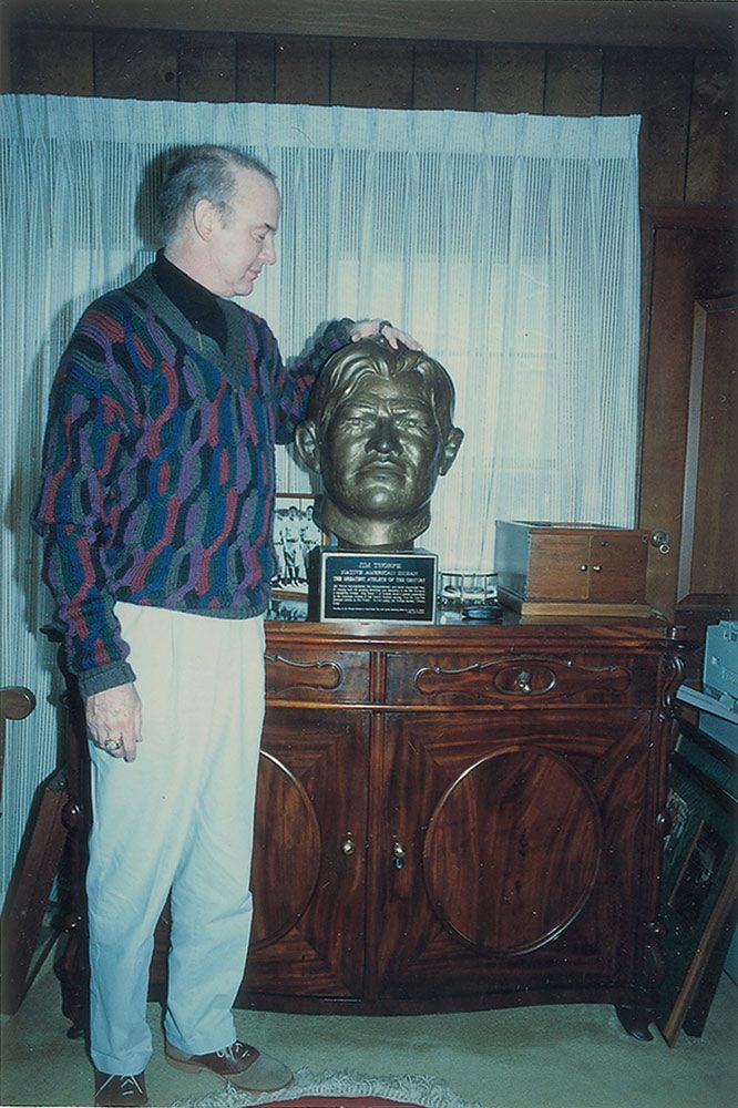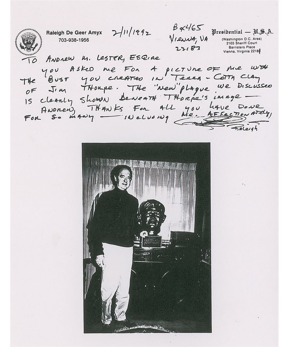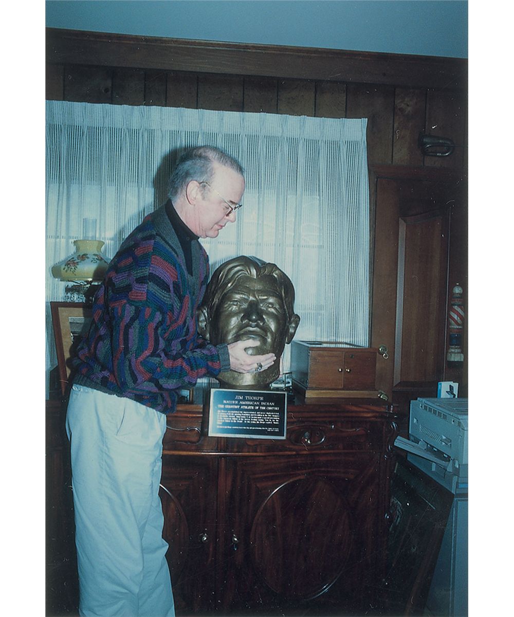 Created by Lester in 1976, the origin of this bronzed bust dates back to a meeting between the artist and Thorpe at Sears store in Oklahoma City in 1932. The violent weather outside prevented a large crowd, and Lester and Thorpe spent over two hours alone, with Thorpe saying at one point, ‘I know you will make a bust of me.’ The original bronze bust was made in 1972 for Lester’s one man show which debuted in 1976, and was later donated to the Miwok Mountain Tribe near Yosemite Park. The bust offered here was originally intended to be presented by Thorpe’s son, Carl Thorpe (who lived within one mile of Raleigh DeGeer Amyx and served President Ronald Reagan in the Bureau of Indian Affairs in Washington), to Speaker of the House Thomas ‘Tip’ O’Neill for permanent display in the US Capitol. However, Carl’s sudden death prevented the delivery of this original signed bust to the Capitol. A truly remarkable piece of art, complete with unparalleled provenance, which pays tribute to one of the greatest athletes of all time. This offering is deserving of a place in the most discriminating collection or institution.