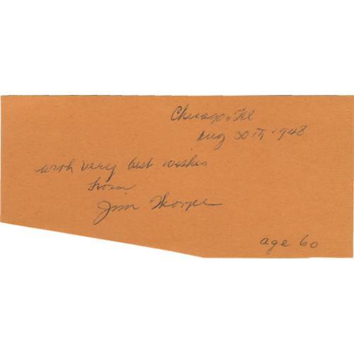 <B>1948 Jim Thorpe Signed Note.</B></I> The greatest Native American sporting hero in our nation's history pens a brief greeting to a fan, writing, "Chicago, Ill, Aug. 30th, 1948, with very best wishes from Jim Thorpe, Age 60." All ink is 9/10, residing on a tangerine colored slip of paper measuring approximately 2.5x5.5". An essential component of any serious twentieth century sports autograph collection. <I>LOA from PSA/DNA. LOA from James Spence Authentication.</B></I><BR><BR><b>Shipping:</b> Flat Material, Small (<a target="_blank" href="http://www.heritageauctions.com/common/shipping.php">view shipping information</a>) <BR><BR><B>Important noti