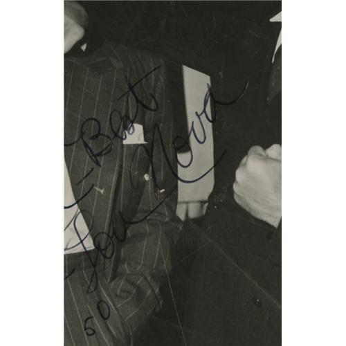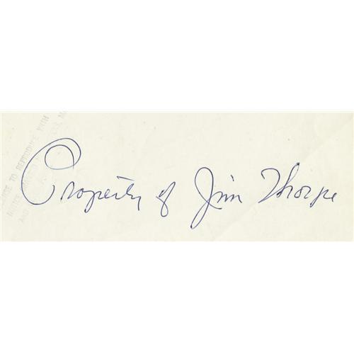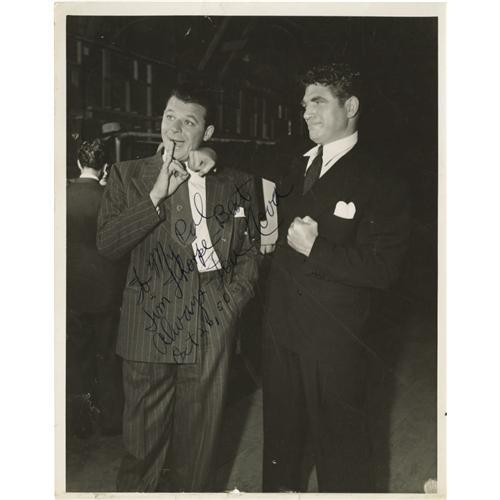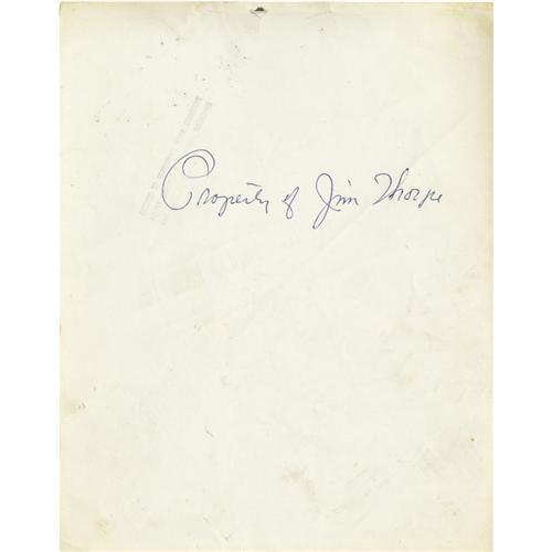 <B>Jim Thorpe & Lou Nova Signed Photograph.</B></I> Image measures 8x10" in size and pictures heavyweight boxer and actor Nova clowning with a friend. Nova's black ink inscription contrasts poorly against the dark background of the photo, but rates a technical 10/10. It reads, "To My Pal Jim Thorpe, Best Always, Lou Nova, Oct. 26, 50." Blue ink inscription on verso rates 10/10, and reads, "Property of Jim Thorpe." Photo shows mild creasing and a small hole near the lower border, but visual appeal is not negatively affected. <I>LOA from PSA/DNA.</B></I> <BR><BR><B>Important notice:</B> Heritage usually auctions material at the rate of 200-250 lots per hour. On some occasions eBay Live bid software or the Internet may not be able to keep up with the pace of the auction. We recommend placing a realistic absentee bid now as insurance to avoid disappointment. Occasionally the auctioneer may eliminate or reject an eBay Live bid, and the auctioneer may also reopen a lot after the close of the eBay live bidding (usually because we missed an audience bid), and may reject your bid even if it shows you as the winning bidder. By bidding via eBay Live, you agree that Heritage may award the lot to another bidder at its sole discretion under the circumstances described above or any other reasonable circumstances. Since eBay bids are not shown to us until we open the lot on the floor, we treat those bids just like floor bids. In most cases the floor responds before the eBay bid is presented to us, due to Internet lag time, so for consistency we have made it a policy that floor bids are always considered first over tie eBay live bids. Also please note that all Heritage lots purchased through eBay Live carry a 22.5% Buyer's Premium. Please make sure you read the Terms and Conditions before you bid. This lot is being auctioned in conjunction with a live floor auction by Heritage Galleries & Auctioneers. All final auction and invoice information will be supplied by Heritage Galleries & Auctioneers, and all other information should be considered preliminary. Lot:19348 <BR><BR><B>Winning Notification and Billing:</B> After the FINAL session in this auction is complete, Heritage will send e-mail and snail mail invoices. This process normally takes several days. All final auction and invoice information will be supplied by Heritage Galleries & Auctioneers, and all other information should be considered preliminary. <BR><BR>This auction will be conducted on a live auction floor and over the Internet through eBay Live. If you choose to place an absentee bid, please take a moment to <font color='#0000ff'><u><a href='http://pages.ebay.com/liveauctions/help/before/laabsentee.html'>learn how eBay Live absentee bidding works</a></u></font><font color='#000000'>