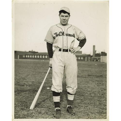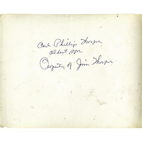 <B>1950's Jim Thorpe Signed Photograph.</B></I> Image measures 8x10" in size and pictures Thorpe's son in baseball uniform. Blue ink inscription on verso rates 10/10, and reads, "Carl Phillip Thorpe, oldest son, Property of Jim Thorpe." Photo shows mild creasing and edge wear, but visual appeal is not negatively affected. <I>LOA from PSA/DNA. LOA from James Spence Authentication.</B></I><BR><BR><b>Shipping:</b> Small Flat (<a target="_blank" href="http://www.heritageauctions.com/common/shipping.php">view shipping information</a>)