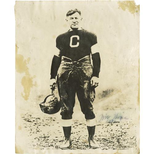 <B>Jim Thorpe Signed Photograph.</B></I> Classic image of Thorpe in the uniform of the Canton Bulldogs measures 8x10" in size and pictures Thorpe at his absolute prime. Blue ink signature at his left knee reads, "Jim Thorpe 1952." It appears that this photograph became wet at one point in its life, leaving staining on front and verso and a slight haze around the autograph, which otherwise would grade 8/10. Verso is blank. Still a highly desirable piece despite imperfect condition, as the autograph remains wonderfully legible, and it appears on the image side of this most famous of Thorpe photos. <I>LOA from PSA/DNA.</B></I> <BR><BR><B>Important notice:</B> Heritage usually auctions material at the rate of 200-250 lots per hour. On some occasions eBay Live bid software or the Internet may not be able to keep up with the pace of the auction. We recommend placing a realistic absentee bid now as insurance to avoid disappointment. Occasionally the auctioneer may eliminate or reject an eBay Live bid, and the auctioneer may also reopen a lot after the close of the eBay live bidding (usually because we missed an audience bid), and may reject your bid even if it shows you as the winning bidder. By bidding via eBay Live, you agree that Heritage may award the lot to another bidder at its sole discretion under the circumstances described above or any other reasonable circumstances. Since eBay bids are not shown to us until we open the lot on the floor, we treat those bids just like floor bids. In most cases the floor responds before the eBay bid is presented to us, due to Internet lag time, so for consistency we have made it a policy that floor bids are always considered first over tie eBay live bids. Also please note that all Heritage lots purchased through eBay Live carry a 22.5% Buyer's Premium. Please make sure you read the Terms and Conditions before you bid. This lot is being auctioned in conjunction with a live floor auction by Heritage Galleries & Auctioneers. All final auction and invoice information will be supplied by Heritage Galleries & Auctioneers, and all other information should be considered preliminary. Lot:19347 <BR><BR><B>Winning Notification and Billing:</B> After the FINAL session in this auction is complete, Heritage will send e-mail and snail mail invoices. This process normally takes several days. All final auction and invoice information will be supplied by Heritage Galleries & Auctioneers, and all other information should be considered preliminary. <BR><BR>This auction will be conducted on a live auction floor and over the Internet through eBay Live. If you choose to place an absentee bid, please take a moment to <font color='#0000ff'><u><a href='http://pages.ebay.com/liveauctions/help/before/laabsentee.html'>learn how eBay Live absentee bidding works</a></u></font><font color='#000000'>