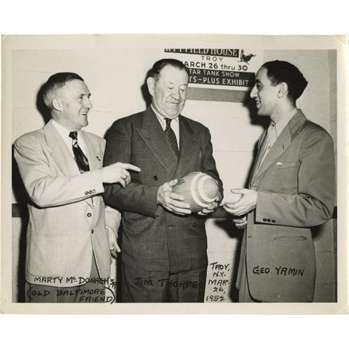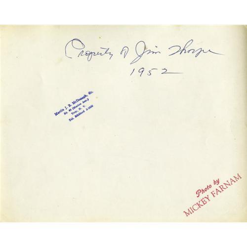 <B>Jim Thorpe Signed Photograph.</B></I> Image measures 8x10" in size and pictures Thorpe with friends. Each is identified in block lettering, with the time and place noted as "Troy, N.Y., Mar. 26, 1952." Blue ink inscription on verso rates 10/10, and reads, "Property of Jim Thorpe, 1952." Photographer's stamping on verso as well. Photo shows only minor wear at the borders but still projects as NRMT. <I>LOA from PSA/DNA.</B></I> <BR><BR><B>Important notice:</B> Heritage usually auctions material at the rate of 200-250 lots per hour. On some occasions eBay Live bid software or the Internet may not be able to keep up with the pace of the auction. We recommend placing a realistic absentee bid now as insurance to avoid disappointment. Occasionally the auctioneer may eliminate or reject an eBay Live bid, and the auctioneer may also reopen a lot after the close of the eBay live bidding (usually because we missed an audience bid), and may reject your bid even if it shows you as the winning bidder. By bidding via eBay Live, you agree that Heritage may award the lot to another bidder at its sole discretion under the circumstances described above or any other reasonable circumstances. Since eBay bids are not shown to us until we open the lot on the floor, we treat those bids just like floor bids. In most cases the floor responds before the eBay bid is presented to us, due to Internet lag time, so for consistency we have made it a policy that floor bids are always considered first over tie eBay live bids. Also please note that all Heritage lots purchased through eBay Live carry a 22.5% Buyer's Premium. Please make sure you read the Terms and Conditions before you bid. This lot is being auctioned in conjunction with a live floor auction by Heritage Galleries & Auctioneers. All final auction and invoice information will be supplied by Heritage Galleries & Auctioneers, and all other information should be considered preliminary. Lot:19356 <BR><BR><B>Winning Notification and Billing:</B> After the FINAL session in this auction is complete, Heritage will send e-mail and snail mail invoices. This process normally takes several days. All final auction and invoice information will be supplied by Heritage Galleries & Auctioneers, and all other information should be considered preliminary. <BR><BR>This auction will be conducted on a live auction floor and over the Internet through eBay Live. If you choose to place an absentee bid, please take a moment to <font color='#0000ff'><u><a href='http://pages.ebay.com/liveauctions/help/before/laabsentee.html'>learn how eBay Live absentee bidding works</a></u></font><font color='#000000'>
