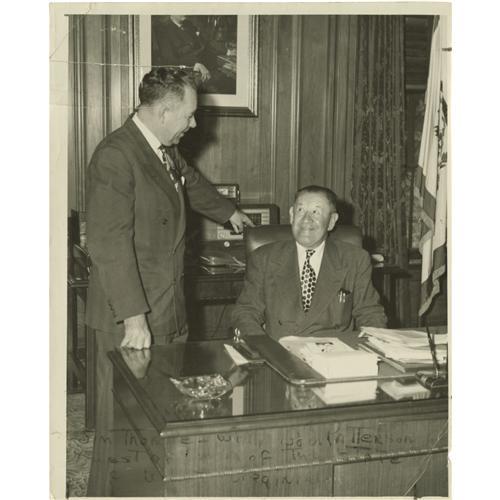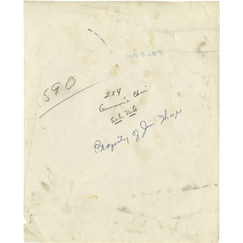 <B>Jim Thorpe Signed Photograph.</B></I> Image measures 8x10" in size and pictures Thorpe sitting behind the desk of the Governor of West Virginia, who stands at Thorpe's right. A grease pencil inscription in an unknown hand on the image side is faded and difficult to discern, but "Governor's chair," again in an unknown hand, clears up those illegible words. Blue ink inscription on verso rates 10/10, and reads, "Property of Jim Thorpe." Date stamp on verso reads "Dec 15, '51." Photo shows creasing and edge wear, but image of Thorpe himself is well clear of this, as is his autograph. <I>LOA from PSA/DNA.</B></I> <BR><BR><B>Important notice:</B> Heritage usually auctions material at the rate of 200-250 lots per hour. On some occasions eBay Live bid software or the Internet may not be able to keep up with the pace of the auction. We recommend placing a realistic absentee bid now as insurance to avoid disappointment. Occasionally the auctioneer may eliminate or reject an eBay Live bid, and the auctioneer may also reopen a lot after the close of the eBay live bidding (usually because we missed an audience bid), and may reject your bid even if it shows you as the winning bidder. By bidding via eBay Live, you agree that Heritage may award the lot to another bidder at its sole discretion under the circumstances described above or any other reasonable circumstances. Since eBay bids are not shown to us until we open the lot on the floor, we treat those bids just like floor bids. In most cases the floor responds before the eBay bid is presented to us, due to Internet lag time, so for consistency we have made it a policy that floor bids are always considered first over tie eBay live bids. Also please note that all Heritage lots purchased through eBay Live carry a 22.5% Buyer's Premium. Please make sure you read the Terms and Conditions before you bid. This lot is being auctioned in conjunction with a live floor auction by Heritage Galleries & Auctioneers. All final auction and invoice information will be supplied by Heritage Galleries & Auctioneers, and all other information should be considered preliminary. Lot:19357 <BR><BR><B>Winning Notification and Billing:</B> After the FINAL session in this auction is complete, Heritage will send e-mail and snail mail invoices. This process normally takes several days. All final auction and invoice information will be supplied by Heritage Galleries & Auctioneers, and all other information should be considered preliminary. <BR><BR>This auction will be conducted on a live auction floor and over the Internet through eBay Live. If you choose to place an absentee bid, please take a moment to <font color='#0000ff'><u><a href='http://pages.ebay.com/liveauctions/help/before/laabsentee.html'>learn how eBay Live absentee bidding works</a></u></font><font color='#000000'>
