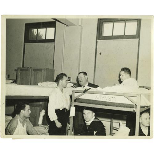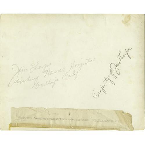 <B>Jim Thorpe Signed Photograph.</B></I> Image measures 8x10" in size and pictures Thorpe visiting a military hospital. Pencil inscription on verso rates 10/10, and reads, "Jim Thorpe visiting Naval Hospital, Vallejo, Calif." Another hand has written "Property of Jim Thorpe." Paper caption reading "Jim Thorpe visiting Naval Veterans Naval Hospital, Vallejo, California" on verso. Photo shows some moderate creasing at edges, but still presents very well. <I>LOA from PSA/DNA.</B></I> <BR><BR><B>Important notice:</B> Heritage usually auctions material at the rate of 200-250 lots per hour. On some occasions eBay Live bid software or the Internet may not be able to keep up with the pace of the auction. We recommend placing a realistic absentee bid now as insurance to avoid disappointment. Occasionally the auctioneer may eliminate or reject an eBay Live bid, and the auctioneer may also reopen a lot after the close of the eBay live bidding (usually because we missed an audience bid), and may reject your bid even if it shows you as the winning bidder. By bidding via eBay Live, you agree that Heritage may award the lot to another bidder at its sole discretion under the circumstances described above or any other reasonable circumstances. Since eBay bids are not shown to us until we open the lot on the floor, we treat those bids just like floor bids. In most cases the floor responds before the eBay bid is presented to us, due to Internet lag time, so for consistency we have made it a policy that floor bids are always considered first over tie eBay live bids. Also please note that all Heritage lots purchased through eBay Live carry a 22.5% Buyer's Premium. Please make sure you read the Terms and Conditions before you bid. This lot is being auctioned in conjunction with a live floor auction by Heritage Galleries & Auctioneers. All final auction and invoice information will be supplied by Heritage Galleries & Auctioneers, and all other information should be considered preliminary. Lot:19364 <BR><BR><B>Winning Notification and Billing:</B> After the FINAL session in this auction is complete, Heritage will send e-mail and snail mail invoices. This process normally takes several days. All final auction and invoice information will be supplied by Heritage Galleries & Auctioneers, and all other information should be considered preliminary. <BR><BR>This auction will be conducted on a live auction floor and over the Internet through eBay Live. If you choose to place an absentee bid, please take a moment to <font color='#0000ff'><u><a href='http://pages.ebay.com/liveauctions/help/before/laabsentee.html'>learn how eBay Live absentee bidding works</a></u></font><font color='#000000'>