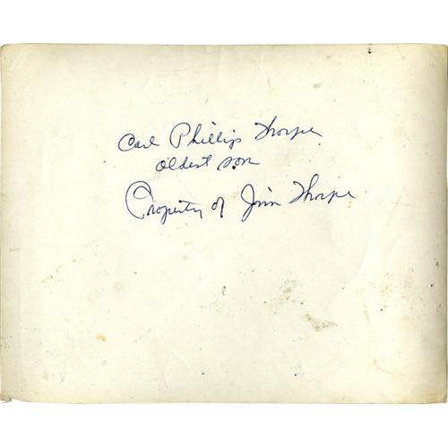 <B>Jim Thorpe Signed Photograph.</B></I> Image measures 8x10" in size and pictures Thorpe's son in baseball uniform. Blue ink inscription on verso rates 10/10, and reads, "Carl Phillip Thorpe, oldest son, Property of Jim Thorpe." Photo shows mild creasing and edge wear, but visual appeal is not negatively affected. <I>LOA from PSA/DNA.</B></I> <BR><BR><B>Important notice:</B> Heritage usually auctions material at the rate of 200-250 lots per hour. On some occasions eBay Live bid software or the Internet may not be able to keep up with the pace of the auction. We recommend placing a realistic absentee bid now as insurance to avoid disappointment. Occasionally the auctioneer may eliminate or reject an eBay Live bid, and the auctioneer may also reopen a lot after the close of the eBay live bidding (usually because we missed an audience bid), and may reject your bid even if it shows you as the winning bidder. By bidding via eBay Live, you agree that Heritage may award the lot to another bidder at its sole discretion under the circumstances described above or any other reasonable circumstances. Since eBay bids are not shown to us until we open the lot on the floor, we treat those bids just like floor bids. In most cases the floor responds before the eBay bid is presented to us, due to Internet lag time, so for consistency we have made it a policy that floor bids are always considered first over tie eBay live bids. Also please note that all Heritage lots purchased through eBay Live carry a 22.5% Buyer's Premium. Please make sure you read the Terms and Conditions before you bid. This lot is being auctioned in conjunction with a live floor auction by Heritage Galleries & Auctioneers. All final auction and invoice information will be supplied by Heritage Galleries & Auctioneers, and all other information should be considered preliminary. Lot:19365 <BR><BR><B>Winning Notification and Billing:</B> After the FINAL session in this auction is complete, Heritage will send e-mail and snail mail invoices. This process normally takes several days. All final auction and invoice information will be supplied by Heritage Galleries & Auctioneers, and all other information should be considered preliminary. <BR><BR>This auction will be conducted on a live auction floor and over the Internet through eBay Live. If you choose to place an absentee bid, please take a moment to <font color='#0000ff'><u><a href='http://pages.ebay.com/liveauctions/help/before/laabsentee.html'>learn how eBay Live absentee bidding works</a></u></font><font color='#000000'>