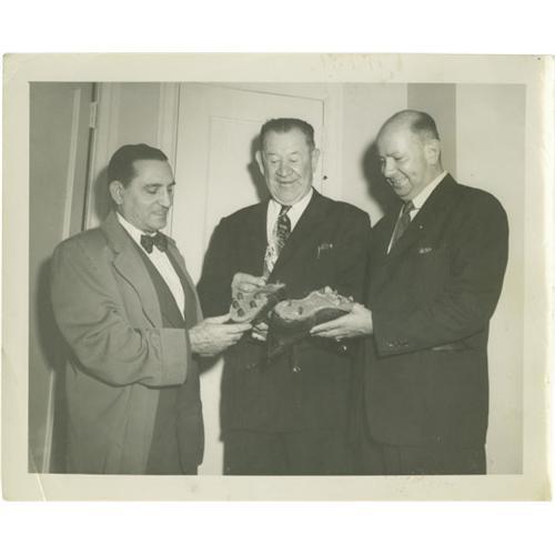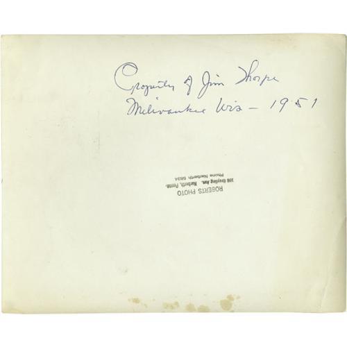 <B>Jim Thorpe Signed Photograph.</B></I> Image measures 8x10" in size and pictures Thorpe examining a pair of football cleats with two other gentleman. Blue ink inscription on verso rates 10/10, and reads, "Property of Jim Thorpe, Milwaukee Wis - 1951." Photographer's stamping on verso. Photo has minor foxing far from the inscription on verso and a light corner crease, but otherwise remains in wonderful NRMT condition. <I>LOA from PSA/DNA.</B></I> <BR><BR><B>Important notice:</B> Heritage usually auctions material at the rate of 200-250 lots per hour. On some occasions eBay Live bid software or the Internet may not be able to keep up with the pace of the auction. We recommend placing a realistic absentee bid now as insurance to avoid disappointment. Occasionally the auctioneer may eliminate or reject an eBay Live bid, and the auctioneer may also reopen a lot after the close of the eBay live bidding (usually because we missed an audience bid), and may reject your bid even if it shows you as the winning bidder. By bidding via eBay Live, you agree that Heritage may award the lot to another bidder at its sole discretion under the circumstances described above or any other reasonable circumstances. Since eBay bids are not shown to us until we open the lot on the floor, we treat those bids just like floor bids. In most cases the floor responds before the eBay bid is presented to us, due to Internet lag time, so for consistency we have made it a policy that floor bids are always considered first over tie eBay live bids. Also please note that all Heritage lots purchased through eBay Live carry a 22.5% Buyer's Premium. Please make sure you read the Terms and Conditions before you bid. This lot is being auctioned in conjunction with a live floor auction by Heritage Galleries & Auctioneers. All final auction and invoice information will be supplied by Heritage Galleries & Auctioneers, and all other information should be considered preliminary. Lot:19366 <BR><BR><B>Winning Notification and Billing:</B> After the FINAL session in this auction is complete, Heritage will send e-mail and snail mail invoices. This process normally takes several days. All final auction and invoice information will be supplied by Heritage Galleries & Auctioneers, and all other information should be considered preliminary. <BR><BR>This auction will be conducted on a live auction floor and over the Internet through eBay Live. If you choose to place an absentee bid, please take a moment to <font color='#0000ff'><u><a href='http://pages.ebay.com/liveauctions/help/before/laabsentee.html'>learn how eBay Live absentee bidding works</a></u></font><font color='#000000'>