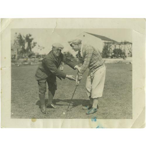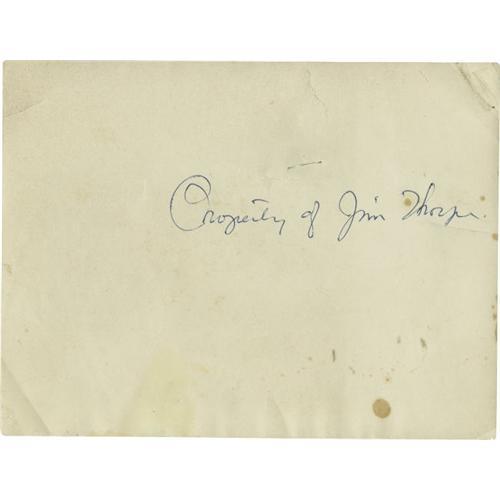 <B>Jim Thorpe Signed Photograph.</B></I> Image measures 6.5x8.5" in size and pictures famed entertainer Will Rogers getting golf tips from an unknown helper. Blue ink inscription on verso rates 10/10, and reads, "Property of Jim Thorpe." Photo shows moderate wear with some creasing, staining and border tears, one of which barely grazes the letter "p" in Thorpe's surname. <I>LOA from PSA/DNA.</B></I> <BR><BR><B>Important notice:</B> Heritage usually auctions material at the rate of 200-250 lots per hour. On some occasions eBay Live bid software or the Internet may not be able to keep up with the pace of the auction. We recommend placing a realistic absentee bid now as insurance to avoid disappointment. Occasionally the auctioneer may eliminate or reject an eBay Live bid, and the auctioneer may also reopen a lot after the close of the eBay live bidding (usually because we missed an audience bid), and may reject your bid even if it shows you as the winning bidder. By bidding via eBay Live, you agree that Heritage may award the lot to another bidder at its sole discretion under the circumstances described above or any other reasonable circumstances. Since eBay bids are not shown to us until we open the lot on the floor, we treat those bids just like floor bids. In most cases the floor responds before the eBay bid is presented to us, due to Internet lag time, so for consistency we have made it a policy that floor bids are always considered first over tie eBay live bids. Also please note that all Heritage lots purchased through eBay Live carry a 22.5% Buyer's Premium. Please make sure you read the Terms and Conditions before you bid. This lot is being auctioned in conjunction with a live floor auction by Heritage Galleries & Auctioneers. All final auction and invoice information will be supplied by Heritage Galleries & Auctioneers, and all other information should be considered preliminary. Lot:19371 <BR><BR><B>Winning Notification and Billing:</B> After the FINAL session in this auction is complete, Heritage will send e-mail and snail mail invoices. This process normally takes several days. All final auction and invoice information will be supplied by Heritage Galleries & Auctioneers, and all other information should be considered preliminary. <BR><BR>This auction will be conducted on a live auction floor and over the Internet through eBay Live. If you choose to place an absentee bid, please take a moment to <font color='#0000ff'><u><a href='http://pages.ebay.com/liveauctions/help/before/laabsentee.html'>learn how eBay Live absentee bidding works</a></u></font><font color='#000000'>