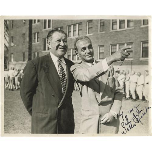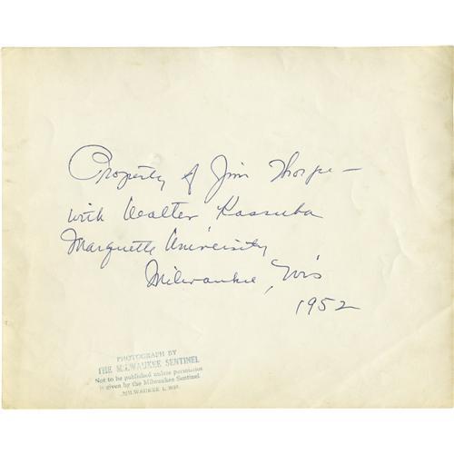 <B>Jim Thorpe Signed Photograph.</B></I> Image measures 8x10" in size and pictures Thorpe overseeing the troops at a Marquette University football practice. The front of the photo is inscribed by the man standing with Thorpe, "To my Pal Jim, Wally Kasuba." Lengthy blue ink inscription on verso rates 10/10, and reads, "Property of Jim Thorpe, with Walter Kassuba, Marquette University, Milwaukee Wis, 1952." Photographer's stamping on verso as well. Photo has single corner crease but otherwise presents as NRMT. <I>LOA from PSA/DNA.</B></I> <BR><BR><B>Important notice:</B> Heritage usually auctions material at the rate of 200-250 lots per hour. On some occasions eBay Live bid software or the Internet may not be able to keep up with the pace of the auction. We recommend placing a realistic absentee bid now as insurance to avoid disappointment. Occasionally the auctioneer may eliminate or reject an eBay Live bid, and the auctioneer may also reopen a lot after the close of the eBay live bidding (usually because we missed an audience bid), and may reject your bid even if it shows you as the winning bidder. By bidding via eBay Live, you agree that Heritage may award the lot to another bidder at its sole discretion under the circumstances described above or any other reasonable circumstances. Since eBay bids are not shown to us until we open the lot on the floor, we treat those bids just like floor bids. In most cases the floor responds before the eBay bid is presented to us, due to Internet lag time, so for consistency we have made it a policy that floor bids are always considered first over tie eBay live bids. Also please note that all Heritage lots purchased through eBay Live carry a 22.5% Buyer's Premium. Please make sure you read the Terms and Conditions before you bid. This lot is being auctioned in conjunction with a live floor auction by Heritage Galleries & Auctioneers. All final auction and invoice information will be supplied by Heritage Galleries & Auctioneers, and all other information should be considered preliminary. Lot:19372 <BR><BR><B>Winning Notification and Billing:</B> After the FINAL session in this auction is complete, Heritage will send e-mail and snail mail invoices. This process normally takes several days. All final auction and invoice information will be supplied by Heritage Galleries & Auctioneers, and all other information should be considered preliminary. <BR><BR>This auction will be conducted on a live auction floor and over the Internet through eBay Live. If you choose to place an absentee bid, please take a moment to <font color='#0000ff'><u><a href='http://pages.ebay.com/liveauctions/help/before/laabsentee.html'>learn how eBay Live absentee bidding works</a></u></font><font color='#000000'>