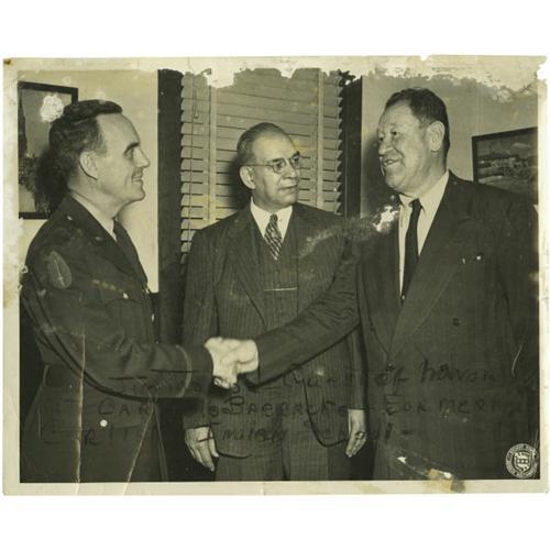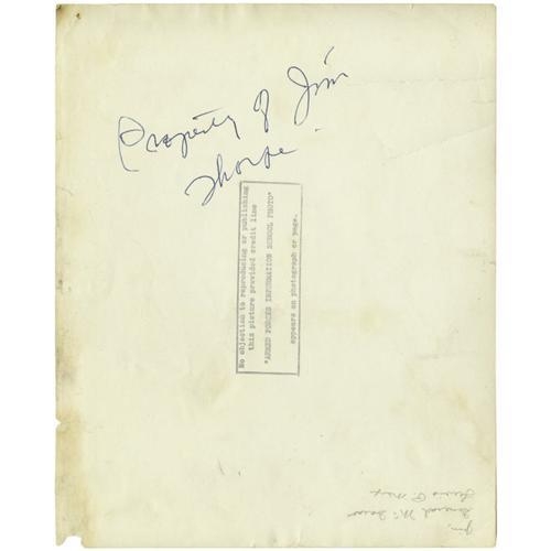 <B>Jim Thorpe Signed Photograph.</B></I> Image measures 8x10" in size and pictures Thorpe visiting his old college stomping grounds. Black grease pencil notation on front in unknown hand reads, "Jim Thorpe, guest of honor at Carlisle Barracks, formerly Carlisle Indian School." Blue ink inscription on verso rates 10/10, and reads, "Property of Jim Thorpe." Photographer's stamping on verso, with pencil notations in an unknown hand. Photo shows heavy wear along upper front and left border and some creasing, but none of this affects the autograph on verso. <I>LOA from PSA/DNA.</B></I> <BR><BR><B>Important notice:</B> Heritage usually auctions material at the rate of 200-250 lots per hour. On some occasions eBay Live bid software or the Internet may not be able to keep up with the pace of the auction. We recommend placing a realistic absentee bid now as insurance to avoid disappointment. Occasionally the auctioneer may eliminate or reject an eBay Live bid, and the auctioneer may also reopen a lot after the close of the eBay live bidding (usually because we missed an audience bid), and may reject your bid even if it shows you as the winning bidder. By bidding via eBay Live, you agree that Heritage may award the lot to another bidder at its sole discretion under the circumstances described above or any other reasonable circumstances. Since eBay bids are not shown to us until we open the lot on the floor, we treat those bids just like floor bids. In most cases the floor responds before the eBay bid is presented to us, due to Internet lag time, so for consistency we have made it a policy that floor bids are always considered first over tie eBay live bids. Also please note that all Heritage lots purchased through eBay Live carry a 22.5% Buyer's Premium. Please make sure you read the Terms and Conditions before you bid. This lot is being auctioned in conjunction with a live floor auction by Heritage Galleries & Auctioneers. All final auction and invoice information will be supplied by Heritage Galleries & Auctioneers, and all other information should be considered preliminary. Lot:19373 <BR><BR><B>Winning Notification and Billing:</B> After the FINAL session in this auction is complete, Heritage will send e-mail and snail mail invoices. This process normally takes several days. All final auction and invoice information will be supplied by Heritage Galleries & Auctioneers, and all other information should be considered preliminary. <BR><BR>This auction will be conducted on a live auction floor and over the Internet through eBay Live. If you choose to place an absentee bid, please take a moment to <font color='#0000ff'><u><a href='http://pages.ebay.com/liveauctions/help/before/laabsentee.html'>learn how eBay Live absentee bidding works</a></u></font><font color='#000000'>