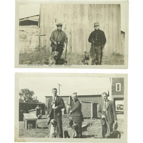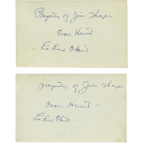 <B>Jim Thorpe Signed Photographs Lot of 2.</B></I> Pair of snapshot photos (each 3.25x5.5") picture Thorpe in hunting gear about to set out after raccoons. Each photo is inscribed in 10/10 blue ink on verso, "Property of Jim Thorpe, Coon Hunt, La Rue, Ohio." Very minor corner creasing and light toning are the only condition issues, and none of this affects the quality of the autographs. <I>LOA from PSA/DNA.</B></I> <BR><BR><B>Important notice:</B> Heritage usually auctions material at the rate of 200-250 lots per hour. On some occasions eBay Live bid software or the Internet may not be able to keep up with the pace of the auction. We recommend placing a realistic absentee bid now as insurance to avoid disappointment. Occasionally the auctioneer may eliminate or reject an eBay Live bid, and the auctioneer may also reopen a lot after the close of the eBay live bidding (usually because we missed an audience bid), and may reject your bid even if it shows you as the winning bidder. By bidding via eBay Live, you agree that Heritage may award the lot to another bidder at its sole discretion under the circumstances described above or any other reasonable circumstances. Since eBay bids are not shown to us until we open the lot on the floor, we treat those bids just like floor bids. In most cases the floor responds before the eBay bid is presented to us, due to Internet lag time, so for consistency we have made it a policy that floor bids are always considered first over tie eBay live bids. Also please note that all Heritage lots purchased through eBay Live carry a 22.5% Buyer's Premium. Please make sure you read the Terms and Conditions before you bid. This lot is being auctioned in conjunction with a live floor auction by Heritage Galleries & Auctioneers. All final auction and invoice information will be supplied by Heritage Galleries & Auctioneers, and all other information should be considered preliminary. Lot:19377 <BR><BR><B>Winning Notification and Billing:</B> After the FINAL session in this auction is complete, Heritage will send e-mail and snail mail invoices. This process normally takes several days. All final auction and invoice information will be supplied by Heritage Galleries & Auctioneers, and all other information should be considered preliminary. <BR><BR>This auction will be conducted on a live auction floor and over the Internet through eBay Live. If you choose to place an absentee bid, please take a moment to <font color='#0000ff'><u><a href='http://pages.ebay.com/liveauctions/help/before/laabsentee.html'>learn how eBay Live absentee bidding works</a></u></font><font color='#000000'>