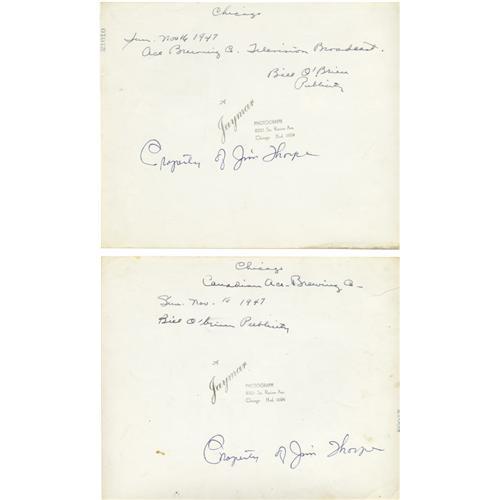 <B>Jim Thorpe Signed Photographs Lot of 2.</B></I> Pair of 8x10" photos picture Thorpe being interviewed for a television show in 1947. Each is inscribed in 10/10 blue ink on verso, "Property of Jim Thorpe." The details of the event, noting place, date, event and gentleman with Thorpe in the photo are also written in the Hall of Famer's hand. Photos measure 8x10" in size and show minimal wear, with only small amounts of creasing and a single short edge tear. <I>LOA from PSA/DNA.</B></I> <BR><BR><B>Important notice:</B> Heritage usually auctions material at the rate of 200-250 lots per hour. On some occasions eBay Live bid software or the Internet may not be able to keep up with the pace of the auction. We recommend placing a realistic absentee bid now as insurance to avoid disappointment. Occasionally the auctioneer may eliminate or reject an eBay Live bid, and the auctioneer may also reopen a lot after the close of the eBay live bidding (usually because we missed an audience bid), and may reject your bid even if it shows you as the winning bidder. By bidding via eBay Live, you agree that Heritage may award the lot to another bidder at its sole discretion under the circumstances described above or any other reasonable circumstances. Since eBay bids are not shown to us until we open the lot on the floor, we treat those bids just like floor bids. In most cases the floor responds before the eBay bid is presented to us, due to Internet lag time, so for consistency we have made it a policy that floor bids are always considered first over tie eBay live bids. Also please note that all Heritage lots purchased through eBay Live carry a 22.5% Buyer's Premium. Please make sure you read the Terms and Conditions before you bid. This lot is being auctioned in conjunction with a live floor auction by Heritage Galleries & Auctioneers. All final auction and invoice information will be supplied by Heritage Galleries & Auctioneers, and all other information should be considered preliminary. Lot:19379 <BR><BR><B>Winning Notification and Billing:</B> After the FINAL session in this auction is complete, Heritage will send e-mail and snail mail invoices. This process normally takes several days. All final auction and invoice information will be supplied by Heritage Galleries & Auctioneers, and all other information should be considered preliminary. <BR><BR>This auction will be conducted on a live auction floor and over the Internet through eBay Live. If you choose to place an absentee bid, please take a moment to <font color='#0000ff'><u><a href='http://pages.ebay.com/liveauctions/help/before/laabsentee.html'>learn how eBay Live absentee bidding works</a></u></font><font color='#000000'>