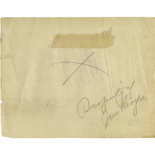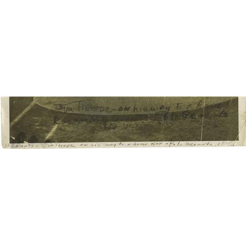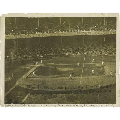 <B>Jim Thorpe Signed Wire Photograph.</B></I> Image measures 8x10" in size and pictures Thorpe rounding the bases at New York City's The Polo Grounds. In both grease pencil and black ink, both in an unknown hand, the front of the photo is inscribed, "Jim Thorpe on his way to a home run, Polo Grounds, 1915." This year may be incorrect, however, as Thorpe's statistics do not show a homer that season, and paper caption on verso of wire photo has been removed. Pencil inscription on verso rates 10/10, and reads, "Property of Jim Thorpe." Photo shows a fair amount of creasing and edge wear, but these factors do not materially affect visual appeal. <I>LOA from PSA/DNA.</B></I> <BR><BR><B>Important notice:</B> Heritage usually auctions material at the rate of 200-250 lots per hour. On some occasions eBay Live bid software or the Internet may not be able to keep up with the pace of the auction. We recommend placing a realistic absentee bid now as insurance to avoid disappointment. Occasionally the auctioneer may eliminate or reject an eBay Live bid, and the auctioneer may also reopen a lot after the close of the eBay live bidding (usually because we missed an audience bid), and may reject your bid even if it shows you as the winning bidder. By bidding via eBay Live, you agree that Heritage may award the lot to another bidder at its sole discretion under the circumstances described above or any other reasonable circumstances. Since eBay bids are not shown to us until we open the lot on the floor, we treat those bids just like floor bids. In most cases the floor responds before the eBay bid is presented to us, due to Internet lag time, so for consistency we have made it a policy that floor bids are always considered first over tie eBay live bids. Also please note that all Heritage lots purchased through eBay Live carry a 22.5% Buyer's Premium. Please make sure you read the Terms and Conditions before you bid. This lot is being auctioned in conjunction with a live floor auction by Heritage Galleries & Auctioneers. All final auction and invoice information will be supplied by Heritage Galleries & Auctioneers, and all other information should be considered preliminary. Lot:19350 <BR><BR><B>Winning Notification and Billing:</B> After the FINAL session in this auction is complete, Heritage will send e-mail and snail mail invoices. This process normally takes several days. All final auction and invoice information will be supplied by Heritage Galleries & Auctioneers, and all other information should be considered preliminary. <BR><BR>This auction will be conducted on a live auction floor and over the Internet through eBay Live. If you choose to place an absentee bid, please take a moment to <font color='#0000ff'><u><a href='http://pages.ebay.com/liveauctions/help/before/laabsentee.html'>learn how eBay Live absentee bidding works</a></u></font><font color='#000000'>
