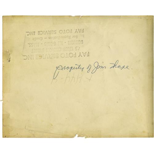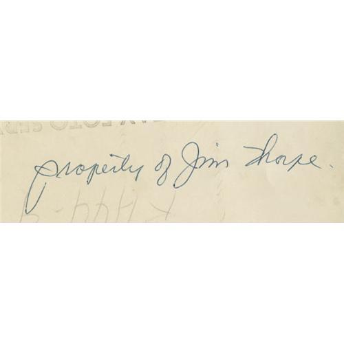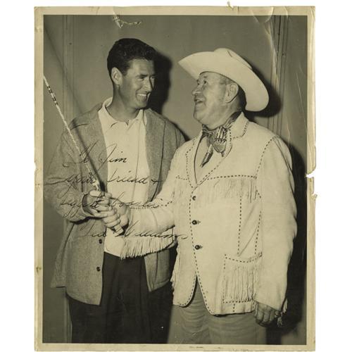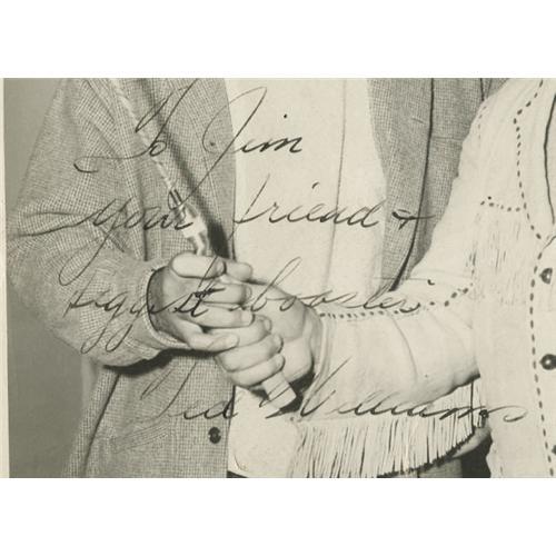 <B>Jim Thorpe & Ted Williams Signed Photograph.</B></I> Image measures 8x10" in size and pictures Thorpe and Ted Williams admiring a fishing rod, a tool with which each was highly familiar. Interestingly, this photo shoot also spawned the number "70" card from the famous 1958 Fleer set celebrating Williams' legendary career. A strong 8/10 black ink inscription on the image side of the photo offers the baseball Hall of Famer's salutation, "To Jim, your friend & biggest booster, Ted Williams." Blue ink inscription on verso rates 10/10, and reads, "Property of Jim Thorpe." Photo shows some wear and tear at the edges that has been reinforced on verso with tape, but visual appeal is not negatively affected and both historic autographs remain well clear. A simply amazing piece! <I>LOA from PSA/DNA.</B></I> <BR><BR><B>Important notice:</B> Heritage usually auctions material at the rate of 200-250 lots per hour. On some occasions eBay Live bid software or the Internet may not be able to keep up with the pace of the auction. We recommend placing a realistic absentee bid now as insurance to avoid disappointment. Occasionally the auctioneer may eliminate or reject an eBay Live bid, and the auctioneer may also reopen a lot after the close of the eBay live bidding (usually because we missed an audience bid), and may reject your bid even if it shows you as the winning bidder. By bidding via eBay Live, you agree that Heritage may award the lot to another bidder at its sole discretion under the circumstances described above or any other reasonable circumstances. Since eBay bids are not shown to us until we open the lot on the floor, we treat those bids just like floor bids. In most cases the floor responds before the eBay bid is presented to us, due to Internet lag time, so for consistency we have made it a policy that floor bids are always considered first over tie eBay live bids. Also please note that all Heritage lots purchased through eBay Live carry a 22.5% Buyer's Premium. Please make sure you read the Terms and Conditions before you bid. This lot is being auctioned in conjunction with a live floor auction by Heritage Galleries & Auctioneers. All final auction and invoice information will be supplied by Heritage Galleries & Auctioneers, and all other information should be considered preliminary. Lot:19349 <BR><BR><B>Winning Notification and Billing:</B> After the FINAL session in this auction is complete, Heritage will send e-mail and snail mail invoices. This process normally takes several days. All final auction and invoice information will be supplied by Heritage Galleries & Auctioneers, and all other information should be considered preliminary. <BR><BR>This auction will be conducted on a live auction floor and over the Internet through eBay Live. If you choose to place an absentee bid, please take a moment to <font color='#0000ff'><u><a href='http://pages.ebay.com/liveauctions/help/before/laabsentee.html'>learn how eBay Live absentee bidding works</a></u></font><font color='#000000'>