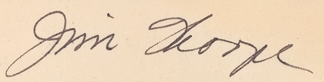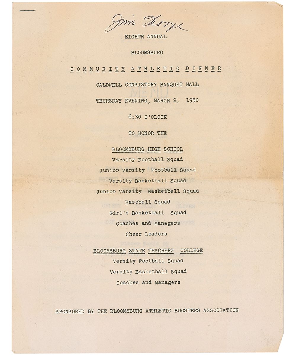 Program from the Eighth Annual Bloomsburg Community Athletic Dinner, held at the Caldwell Conservatory Banquet Hall on March 2, 1950, 8.5 x 11, four pages. Signed at the top of the front cover in black ink by Thorpe. Program is bound together by a staple to top left. In very good to fine condition, with intersecting folds, some light creases, and mild toning to cover. Accompanied by an unsigned commemorative cover.
