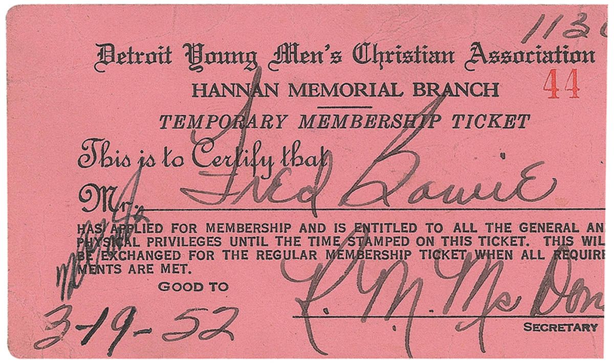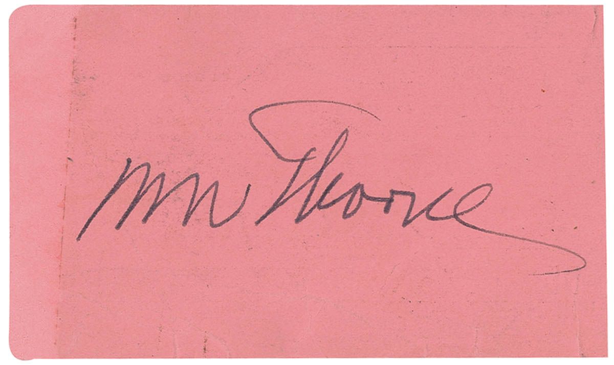 Vintage ink signature, “Jim Thorpe,” on the reverse of a light pink 3.75 x 2 temporary membership card to the Detroit YMCA, dated March 19, 1952. Some scattered light wrinkles and creases, and a trimmed vertical edge, otherwise fine condition.