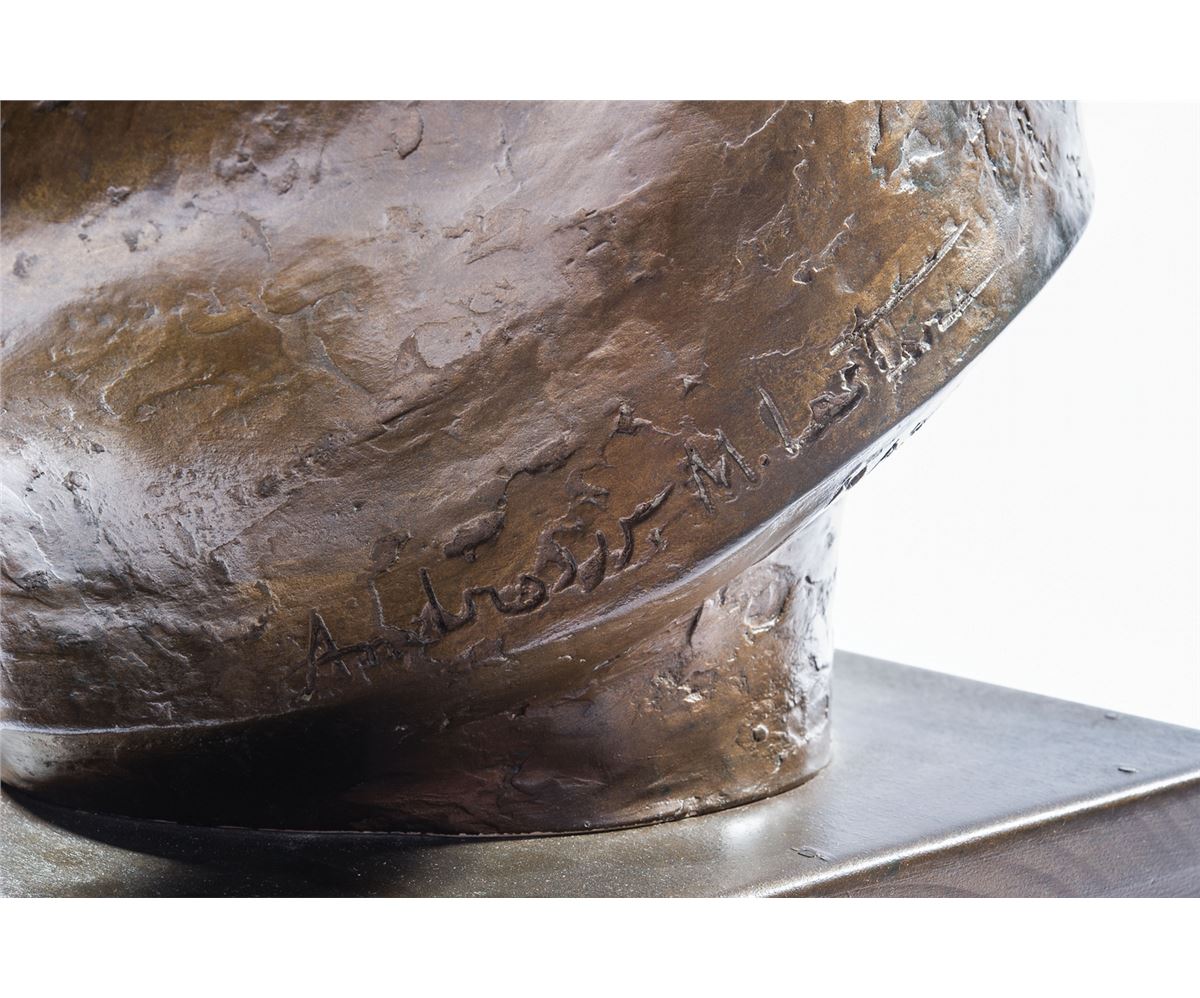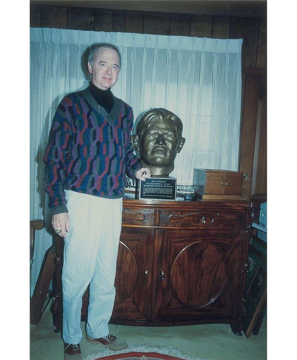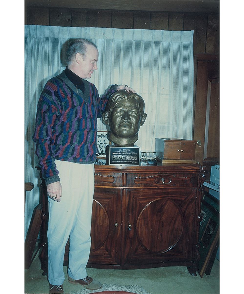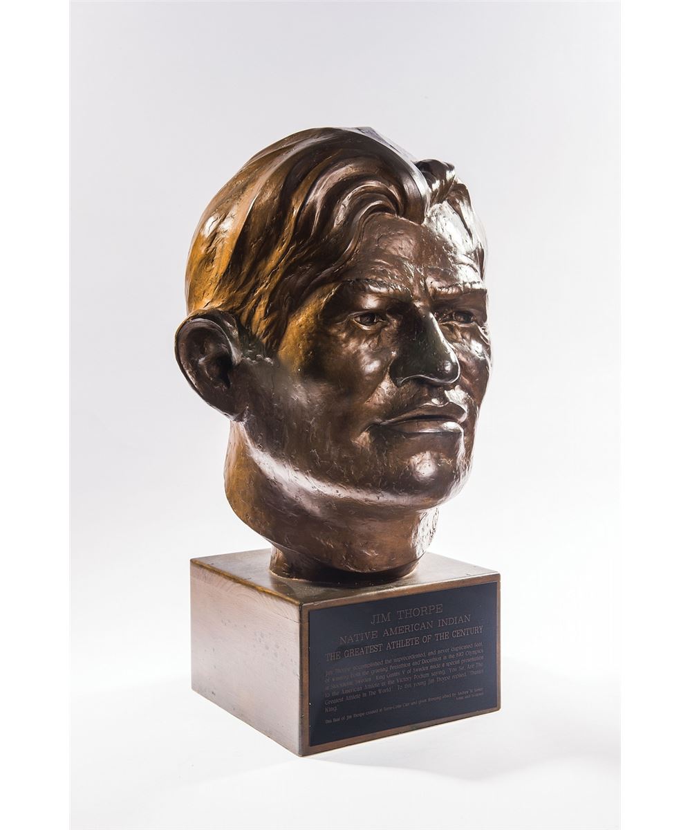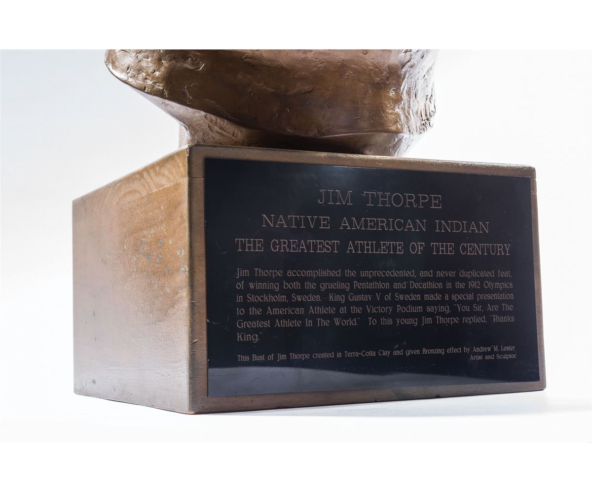 Andrew Lester and Jim Thorpe first met at a Sears store in Oklahoma City in 1932. The violent weather outside prevented a large crowd, and Lester and Thorpe spent over two hours alone, the latter remarking at one point, ‘I know you will make a bust of me.’ The original bronze bust was made in 1972 for Lester’s one-man show which debuted in 1976, and was later donated to the Miwok Mountain Tribe near Yosemite Park. The bust offered here was originally intended to be presented to Speaker of the House Tip O’Neill for permanent display in the US Capitol by Thorpe’s son, Carl Thorpe (who lived within one mile of Raleigh DeGeer Amyx and served President Ronald Reagan in the Bureau of Indian Affairs in Washington). However, Carl’s sudden death prevented the delivery of this original signed bust to the Capitol. A truly remarkable piece of art, paying tribute to one of the greatest athletes of all time. Oversized.