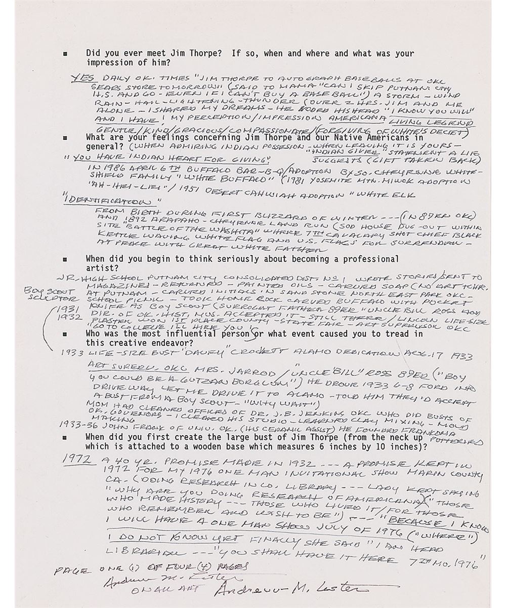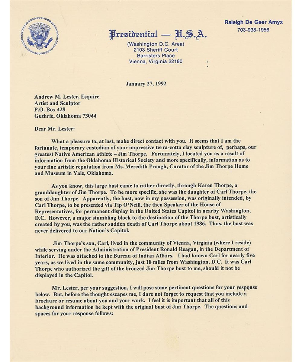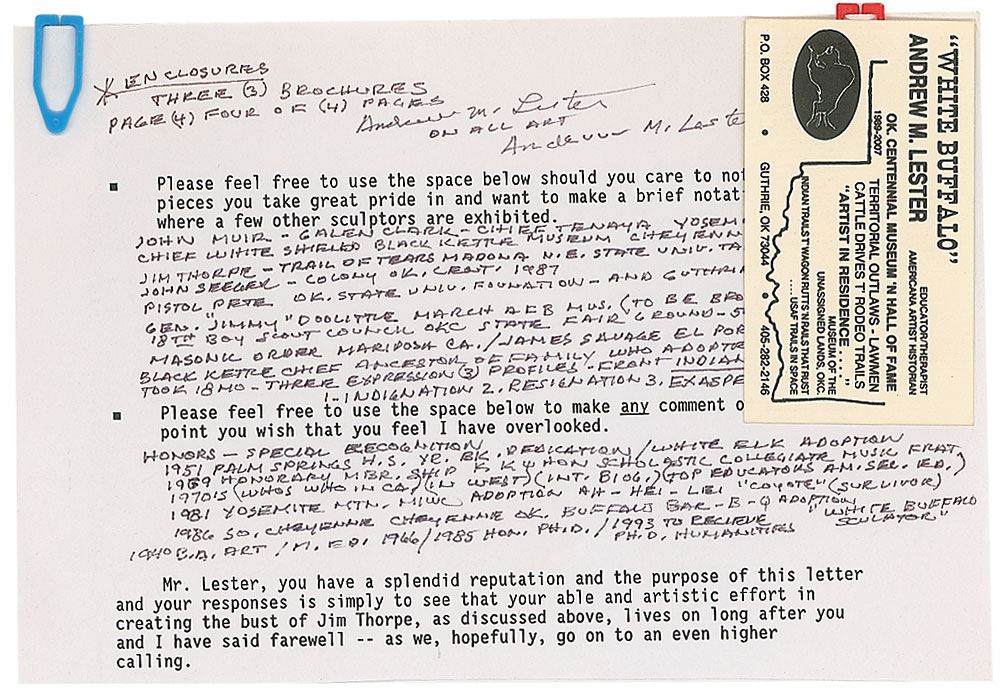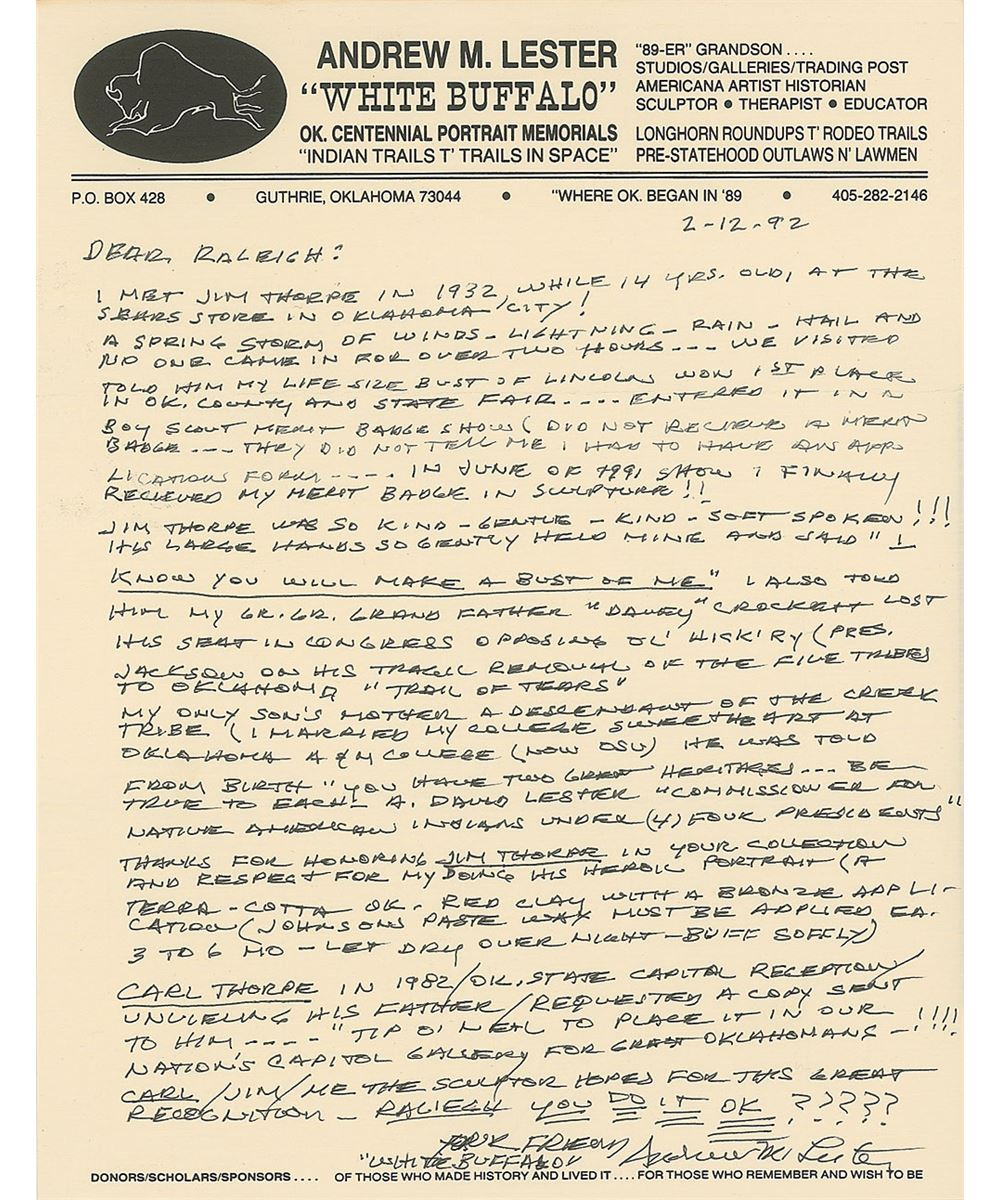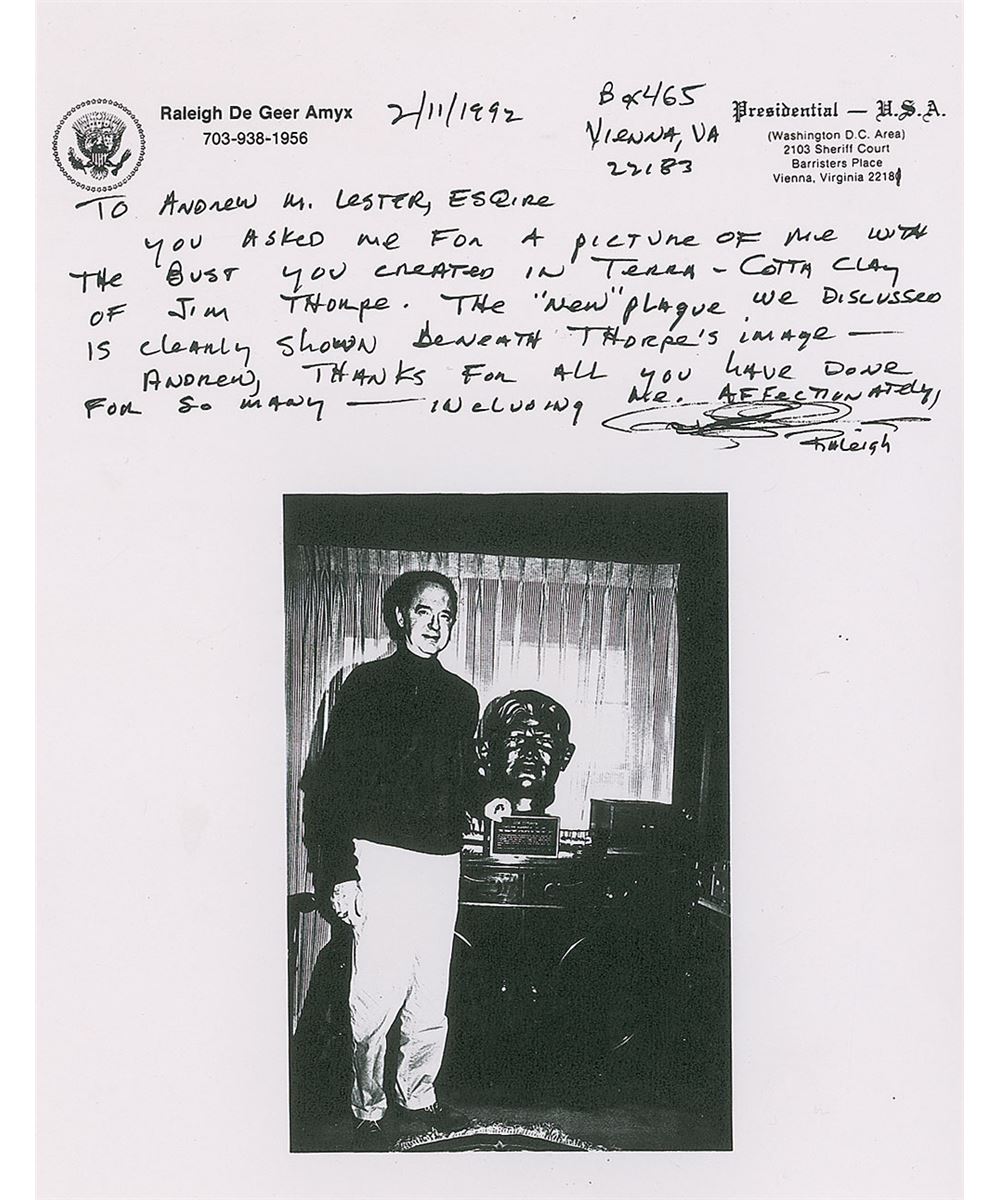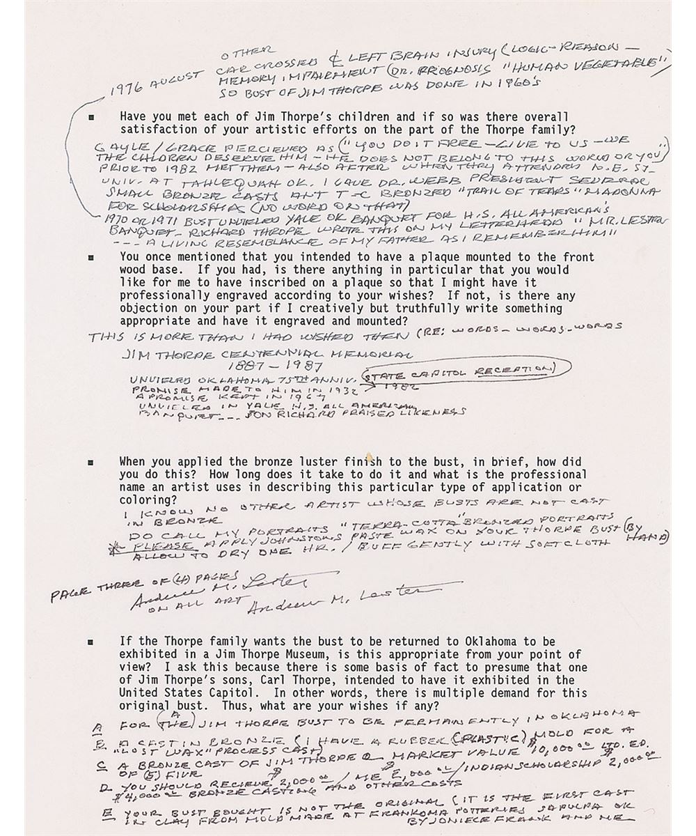 Large original bust of Thorpe with a lovely bronze-like finish, measuring approximately 14 x 16 atop a 10 x 10 x 6 base, with a plaque affixed to the front which begins, “Jim Thorpe, Native American Indian, The Greatest Athlete of the Century.” Bust is signed in the mold by well-known Oklahoma artist Andrew M. Lester, and bears a truly remarkable resemblance to the storied athlete. Jim Thorpe was not only one of the greatest Olympians in history, but also a Major League Baseball player and founding player and member of the National Football League. The bronzed bust is accompanied by an impressive binder full of associated material, including correspondence between Raleigh DeGeer Amyx and artist Andrew Lester, with Lester answering an incredibly detailed four-page questionnaire from Mr. Amyx recounting his meeting with Thorpe, the techniques used in creating the bust, and information on his artistic career. Also included is correspondence between Mr. Amyx and Thorpe’s granddaughter Gail, as well as information on Lester, photos of the bust, and photos and photocopied newspaper articles on Thorpe’s major athletic accomplishments.