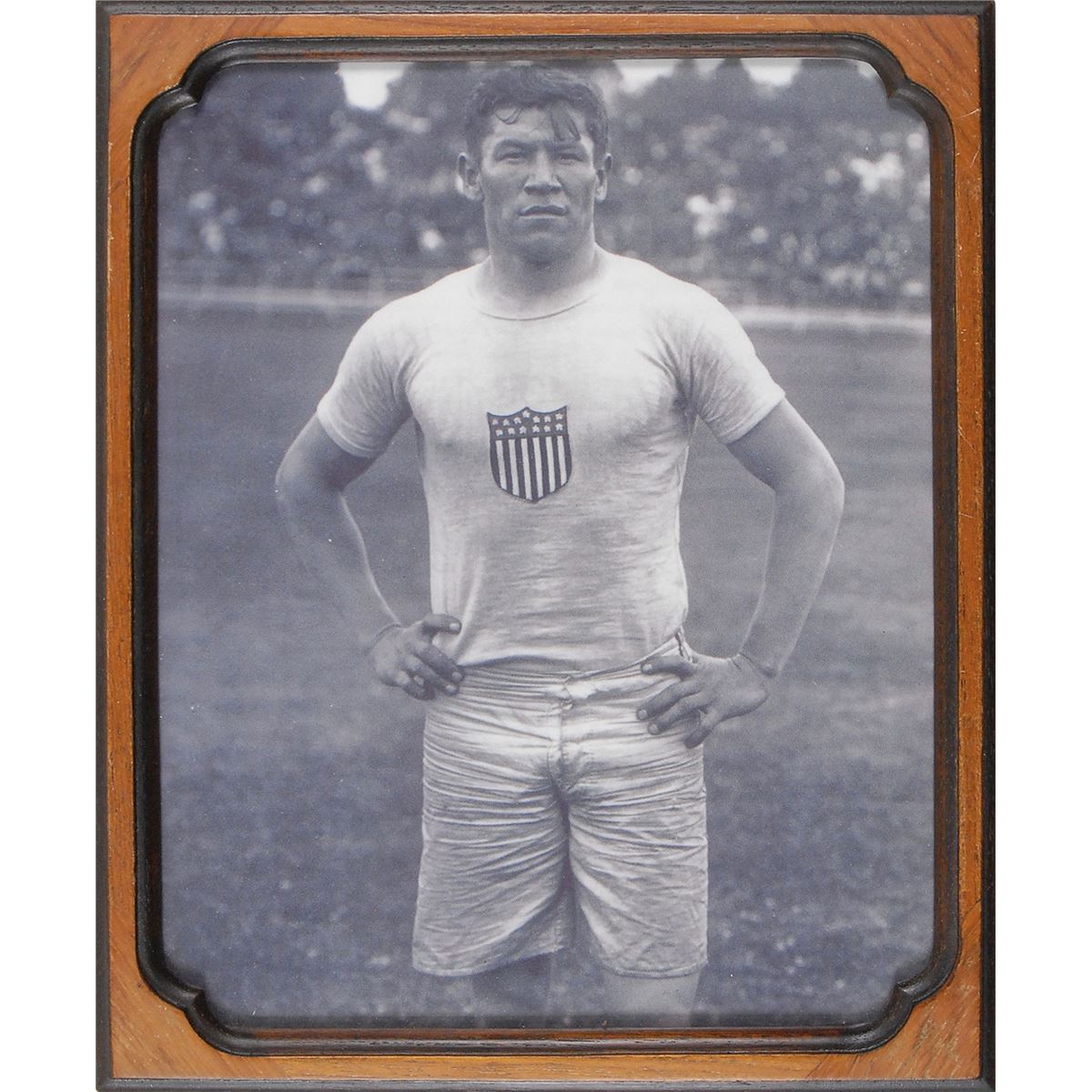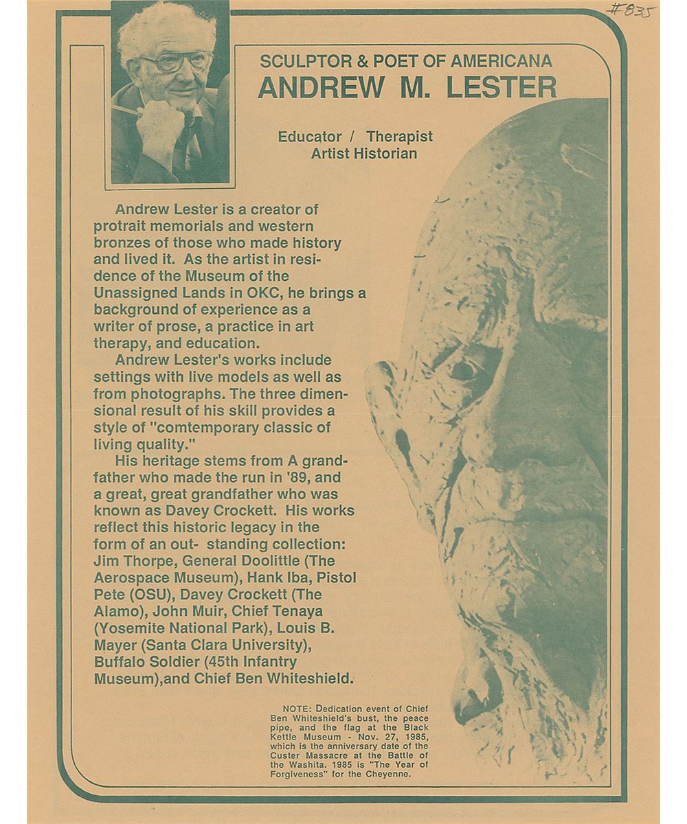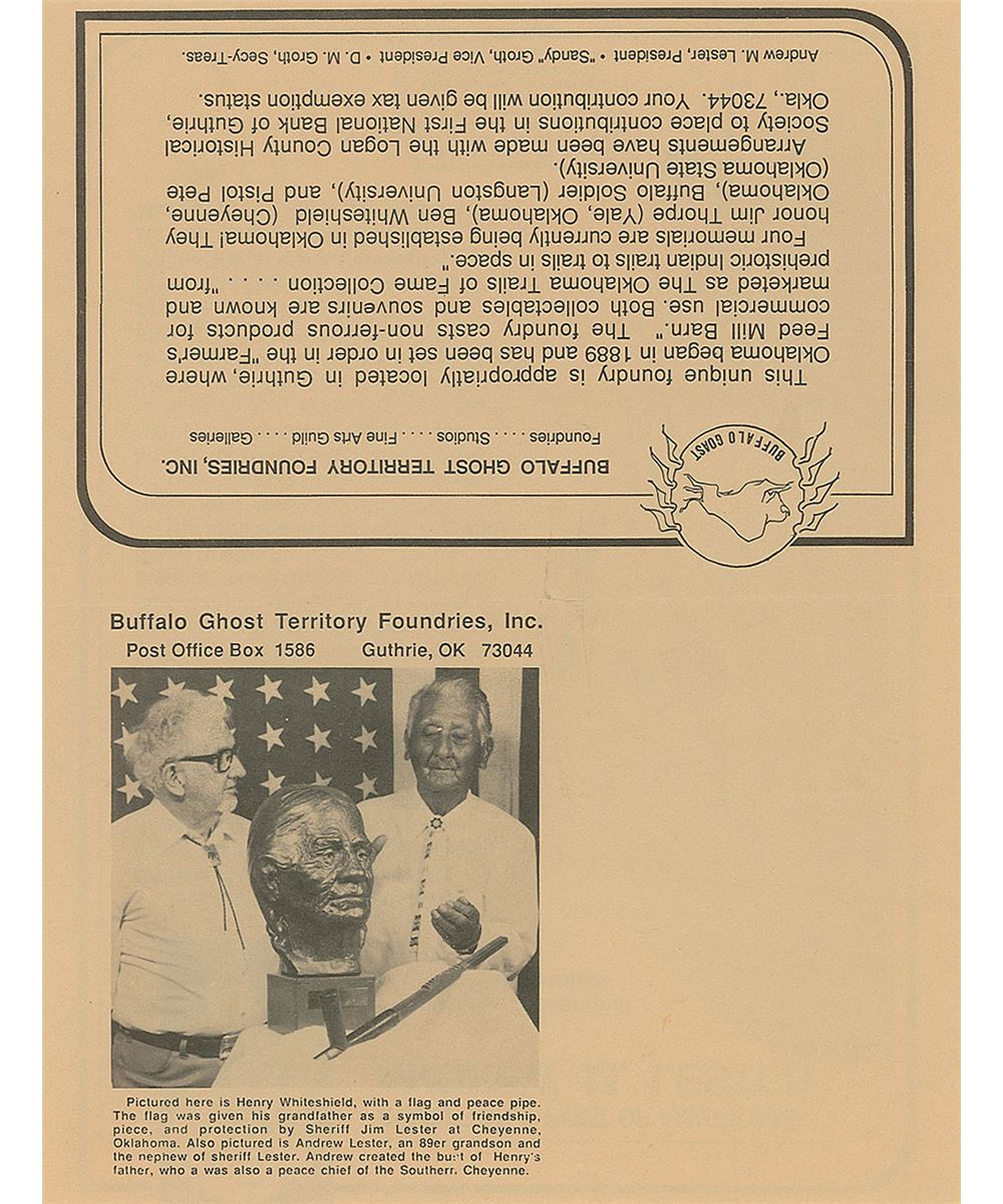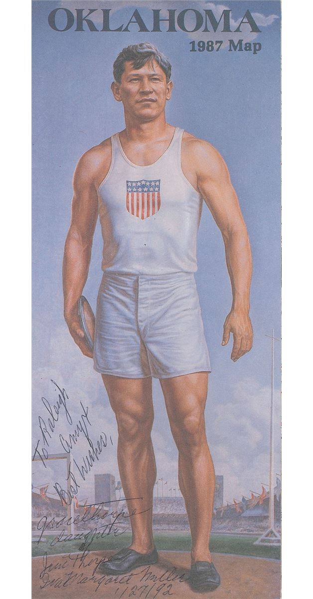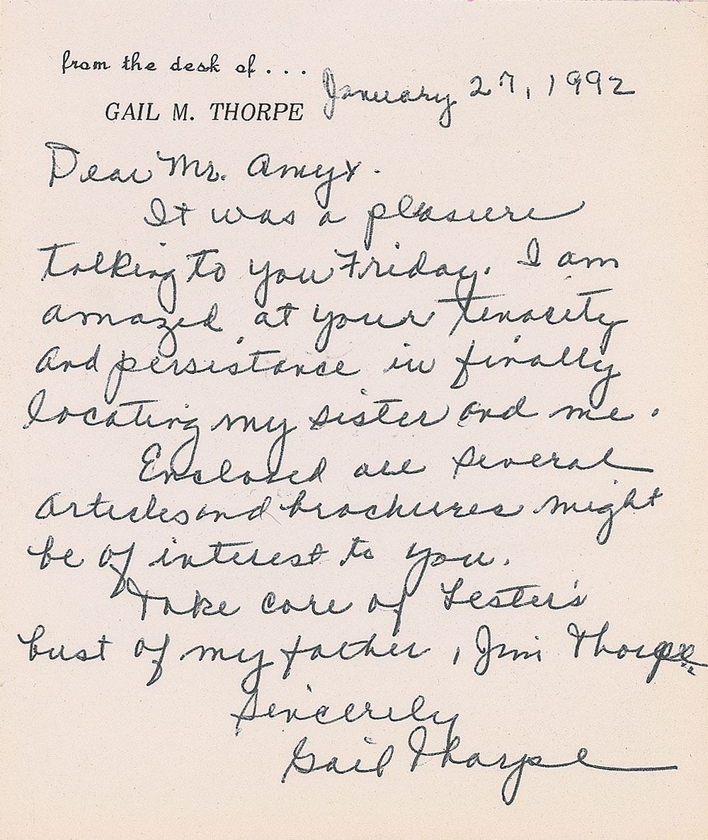 Large original bust of Thorpe with a lovely bronze-like finish, measuring approximately 14 x 16 atop a 10 x 10 x 6 base, with a plaque affixed to the front which begins, “Jim Thorpe, Native American Indian, The Greatest Athlete of the Century.” Bust is signed in the mold by well-known Oklahoma artist Andrew M. Lester, and bears a truly remarkable resemblance to the storied athlete. Jim Thorpe was not only one of the greatest Olympians in history, but also a Major League Baseball player and founding player and member of the National Football League. The bronzed bust is accompanied by an impressive binder full of associated material, including correspondence between Raleigh DeGeer Amyx and artist Andrew Lester, with Lester answering an incredibly detailed four-page questionnaire from Mr. Amyx recounting his meeting with Thorpe, the techniques used in creating the bust, and information on his artistic career. Also included is correspondence between Mr. Amyx and Thorpe’s granddaughter Gail, as well as information on Lester, photos of the bust, and photos and photocopied newspaper articles on Thorpe’s major athletic accomplishments.