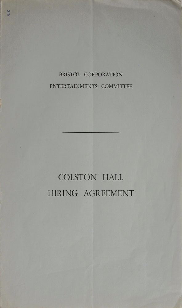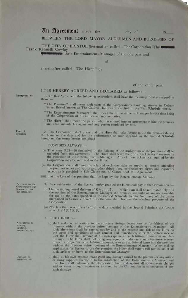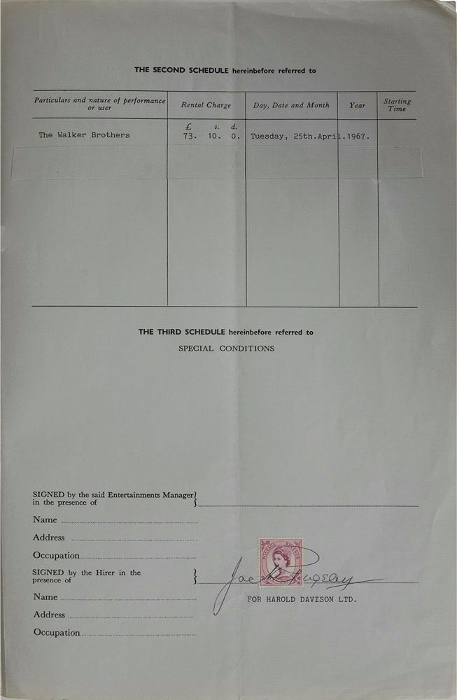 Rare venue contract, five pages, 8 x 13, no date but circa early 1967. Agreement between the City of Bristol and promoters Harold Davison Ltd., for the rental of Colston Hall for a Walker Brothers concert on April 25, 1967, for a total charge of £73.10.0. Signed at the conclusion by a Harold Davison representative. In fine condition, with a central vertical crease and bent upper right corner tip. On April 25, 1967, the Jimi Hendrix Experience performed a pair of shows at Colston Hall as part of the The Walker Brothers headlining 'package tour' alongside other acts like Cat Stevens, Engelbert Humperdinck, The Californians, The Quotations, and MC Nick Jones. This was the Jimi Hendrix Experience's first-ever tour.