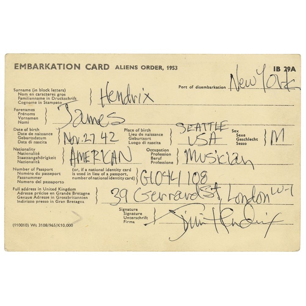 DS, one page, 6 x 4, no date but stamped July 25, 1968. UK customs embarkation card that Jimi Hendrix fills out entirely in his own hand. The various fields, as follows: Port of Disembarkation: “New York,†Surname: “Hendrix,†Forename: “James,†Birth date: “Nov. 27 42,†Birthplace: “Seattle, USA,†Gender: “M,†Nationality: “American,†Occupation: “Musician,†Passport number: “G1044108,†and UK address: “39 Gerrard St., London W-1.†Hendrix has signed his name at the conclusion. In fine condition.