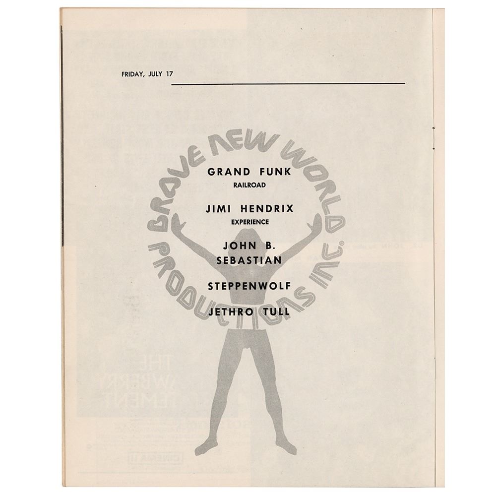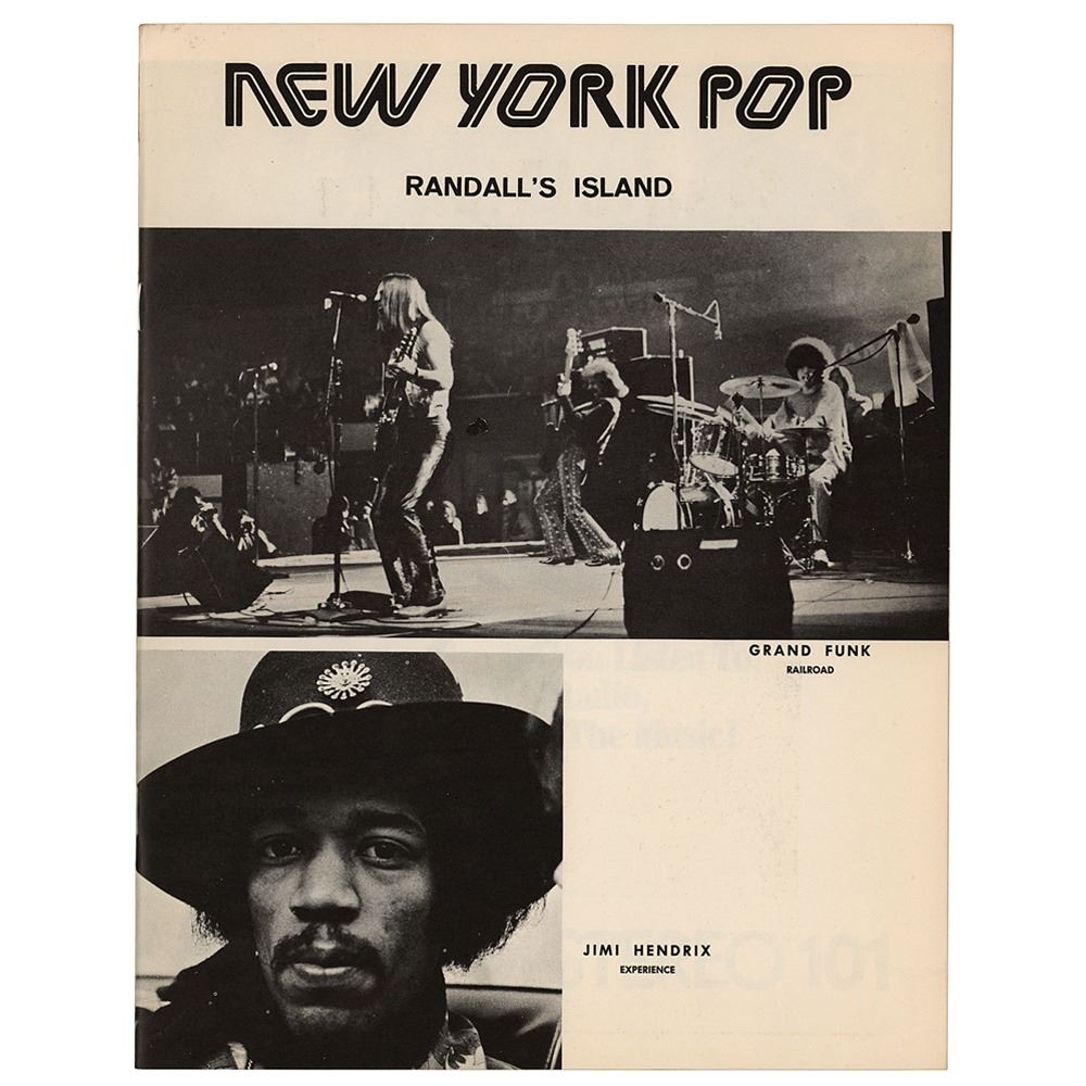 Scarce original program for the New York Pop Festival held at Downing Stadium on Randalls Island on July 17-19, 1970, 8.5 x 11, 24 pages, with the inside featuring images of scheduled performers like the Jimi Hendrix Experience, Grand Funk Railroad, Jethro Tull, Joe Cocker, Van Morrison, Steppenwolf, Richie Havens, Ten Years After, Mountain, Sly and the Family Stone, Ravi Shankar, and The Tony Williams Lifetime, who will be joined on stage by Jack Bruce, Eric Clapton, and special guest star Miles Davis. The first day's (July 17th) performers included Grand Funk Railroad, Jethro Tull, John Sebastian, Steppenwolf, and Jimi Hendrix, who, while on his soon-to-be-known 'Cry of Love' tour, put on a stunning performance with a lengthy set that included Stone Free, Fire, Red House, All Along the Watchtower, Message of Love, Lover Man, Ezy Rider, Foxey Lady, Purple Haze, The Star Spangled Banner, and Voodoo Child (Slight Return). In fine condition, with creasing to the left side of front cover.