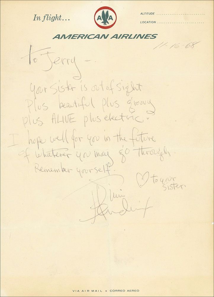 ALS, one page, 7.25 x 10, American Airlines letterhead, November 16, 1968. Letter to "Jerry," in full: "Your sister is out of sight plus beautiful plus groovy plus ALIVE plus electric. I hope well for you in the future of whatever you may go through. Remember yourself." Below, he sketches a heart and adds "to your sister." In fine condition, with interesting folds and mild creasing and toning; the overall visual appeal of this rare piece remains. Accompanied by a letter of provenance from the original recipient, in part: "In November of 1968, my sister Melinda had a flight from New York to L.A. On the flight roster of important people was the name Jimi Hendrix...She introduced herself & told him she wa s a fan of his & had a brother that really liked his music also. But she was too embarrassed to ask for his autograph...she finally asked him but he said he was a little busy right then...As he was leaving the plane, he went up to my sister and apologized...and said give me your brother's address and I will send him my autograph. A few days later I received a letter and autograph from Jimi Hendrix." This incredibly rare letter comes from a significant time in Hendrix's career-on November 16, 1968, his recently released album Electric Ladyland hit number one on the Billboard charts. Despite his wild success and wilder lifestyle-with nearly any woman he pleased at his fingertips-Hendrix was so enamored with the recipient's sister that he decided to sit down, compose, and send this incredible letter. Boasting quintessentially 'out of sight' content from the iconic rock star, this is an extraordinary piece. Pre-certified REAL.