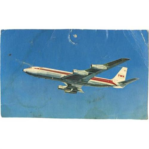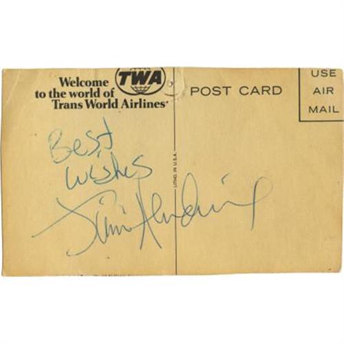 <B>Jimi Hendrix Autographed Postcard.</B></I> A large charismatic Jimi Hendrix autograph in blue ink on the back of a Trans World Airlines postcard. Hendrix signed the postcard on a TWA flight from London to New York, per the request of the flight's service manager, before stretching out on an entire row of seats and sleeping through the rest of the flight! Postcard has been trimmed; otherwise in Very Fine condition with age-toning to card and a tackhole along the top. A letter of provenance accompanies the lot. <I>Accompanied by LOA from PSA/DNA.</B></I><BR><BR><b>Shipping:</b> Flat Material, Small (<a target="_blank" href="http://www.heritageauctions.com/common/shipping.php">view shipping information</a>)
