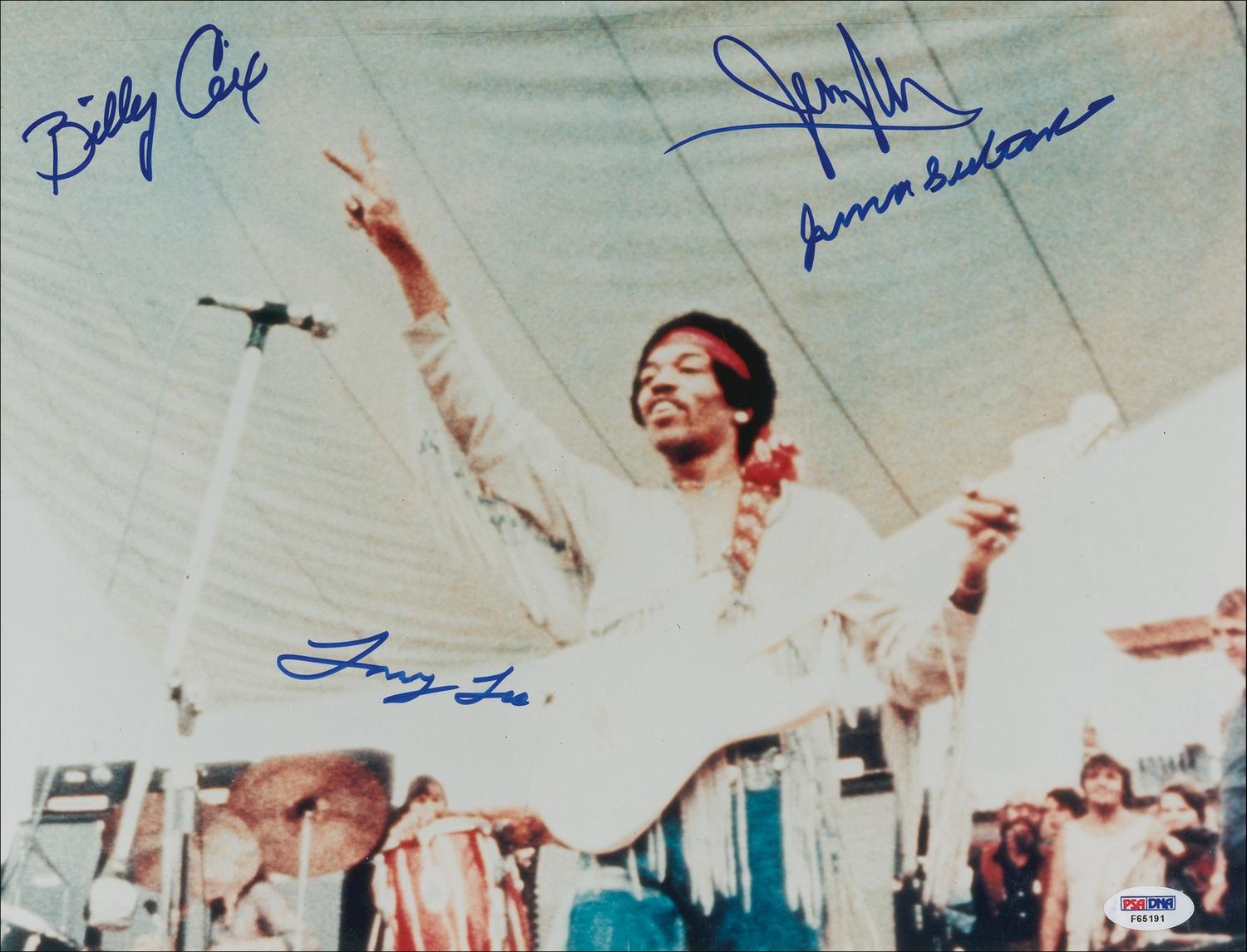 Color glossy 11 x 14 photo of Hendrix on stage at Woodstock, signed in blue felt tip by Jerry Velez, Juma Sultan, Larry Lee, and Billy Cox. In fine condition, with a crease to lower left corner. PSA/DNA authentication label affixed to lower right.