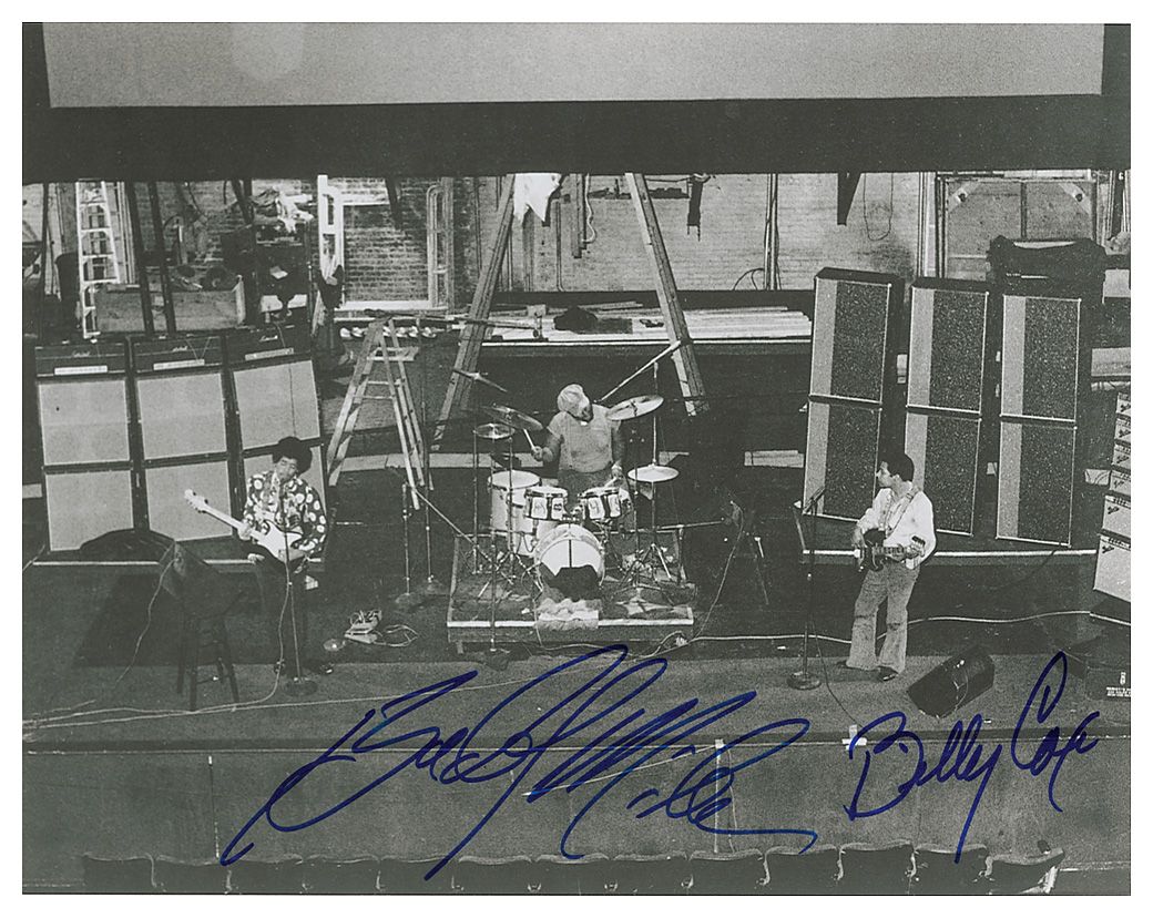 Glossy 14 x 11 photo of the Band of Gypsys doing a sound check for their 1970 New Year’s Eve show, with Jimi Hendrix on the left, signed in blue felt tip by band members Buddy Miles and Billy Cox. In fine condition.